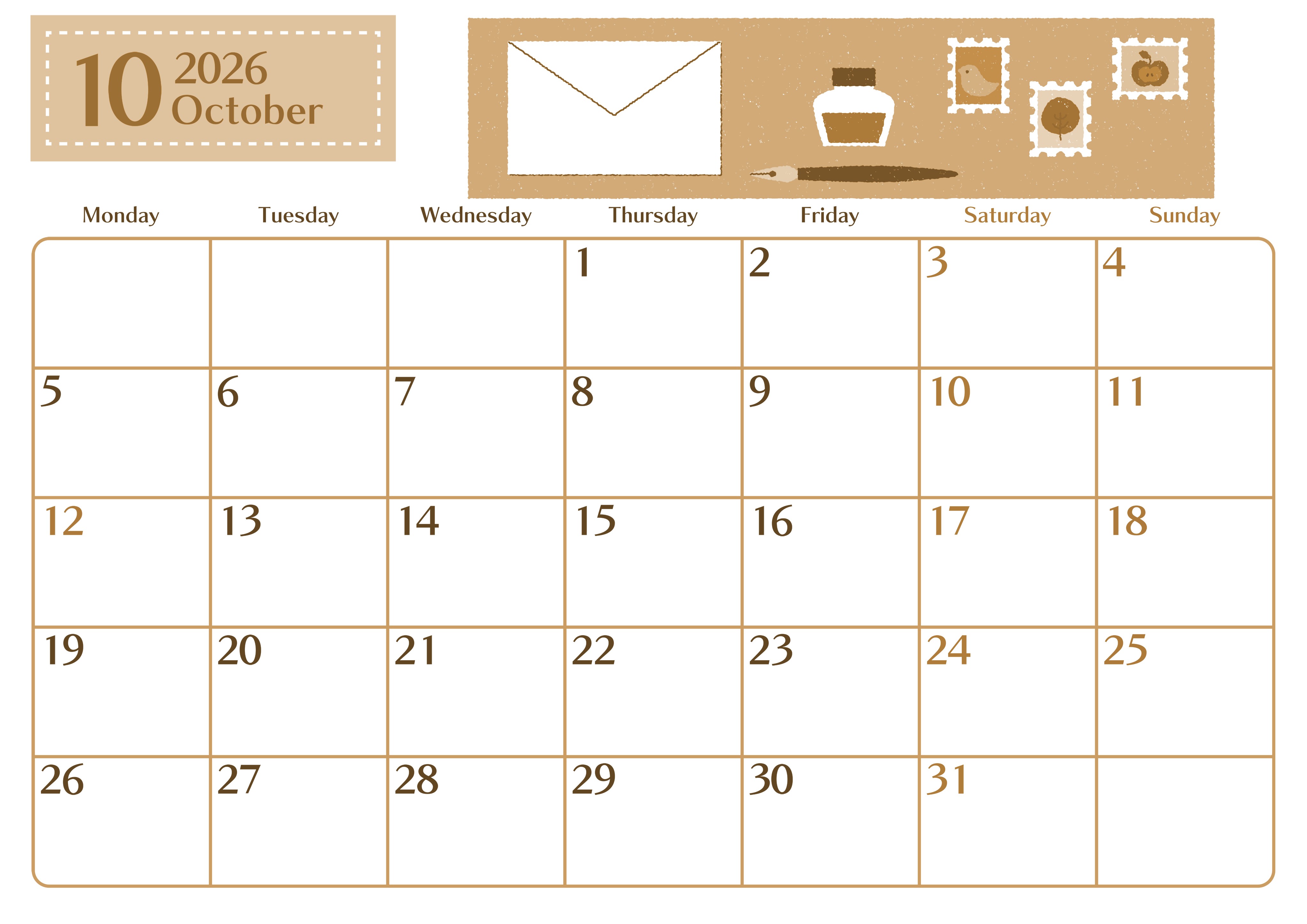 2026年10月横型レトロな月曜始まり 手紙イラストのおしゃれA4無料セピア調カレンダー(2026-00731001)