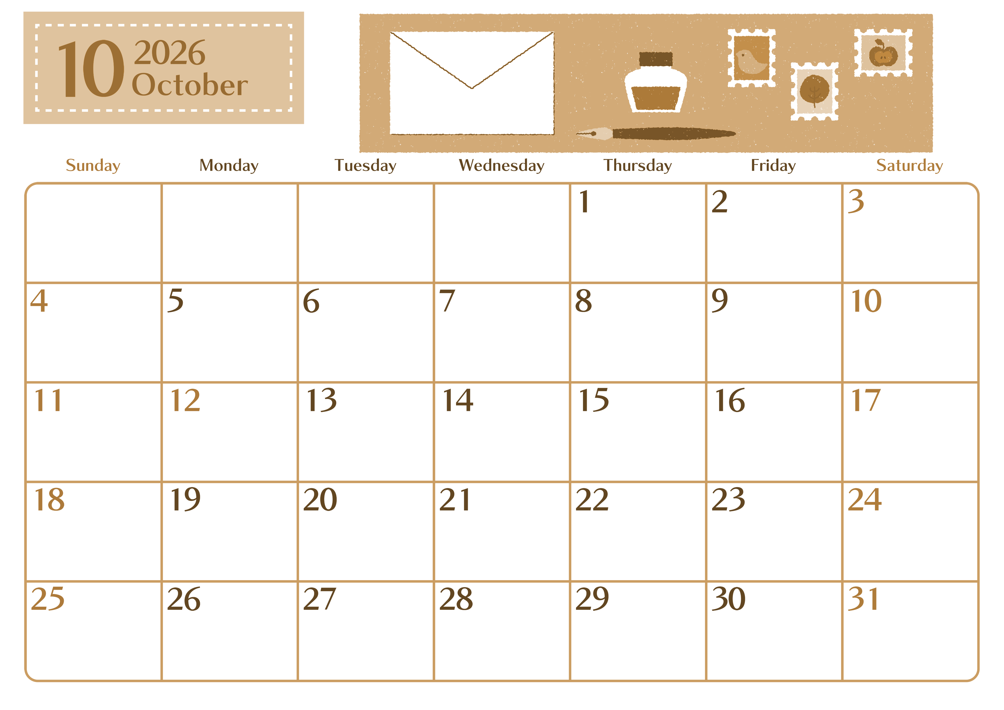 2026年・無料のカレンダーテンプレート 2026年10月横型レトロな日曜始まり 手紙イラストのおしゃれA4無料セピア調カレンダー(2026-00731000) 素材状デザイン王 2025年4月2日 2026年10月横型レトロな日曜始まりの無料テンプレートセピア調カレンダーです。手紙や万年筆や切手のイラストがステーショナリー好きの心に刺さるおしゃれな世界観のセピア調カレンダーを用意しました。(2026-00731000) 10月 横型のカレンダー 日曜始まり セピア カレンダーデザイン-0073
