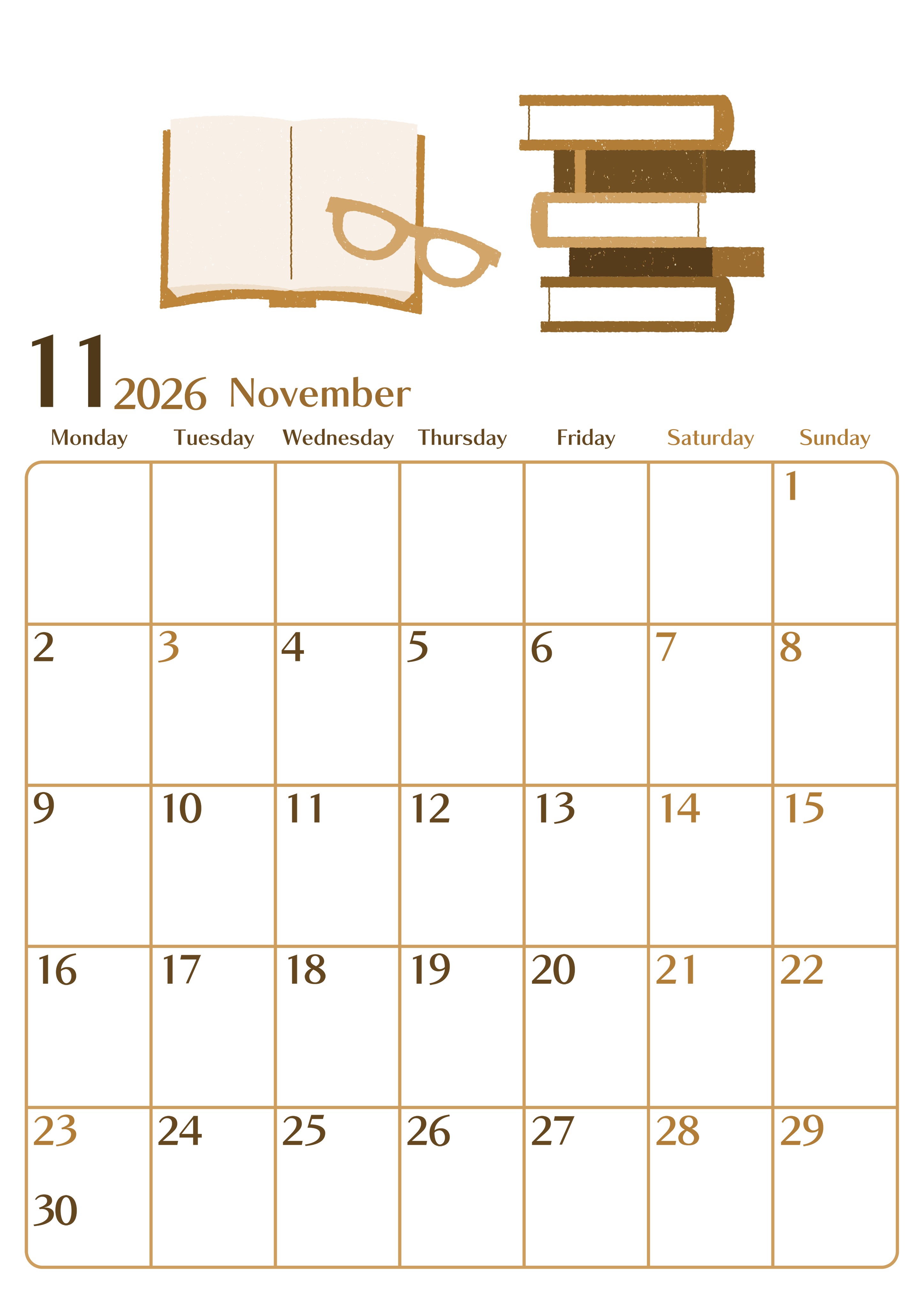 2026年11月縦型レトロな月曜始まりの無料テンプレートセピア調カレンダーです。本の読書モチーフのイラストがおしゃれで予定を書き込みやすい罫線がくっきりとしている実用性の高い縦向きのセピア調カレンダーです。(2026-00731111)