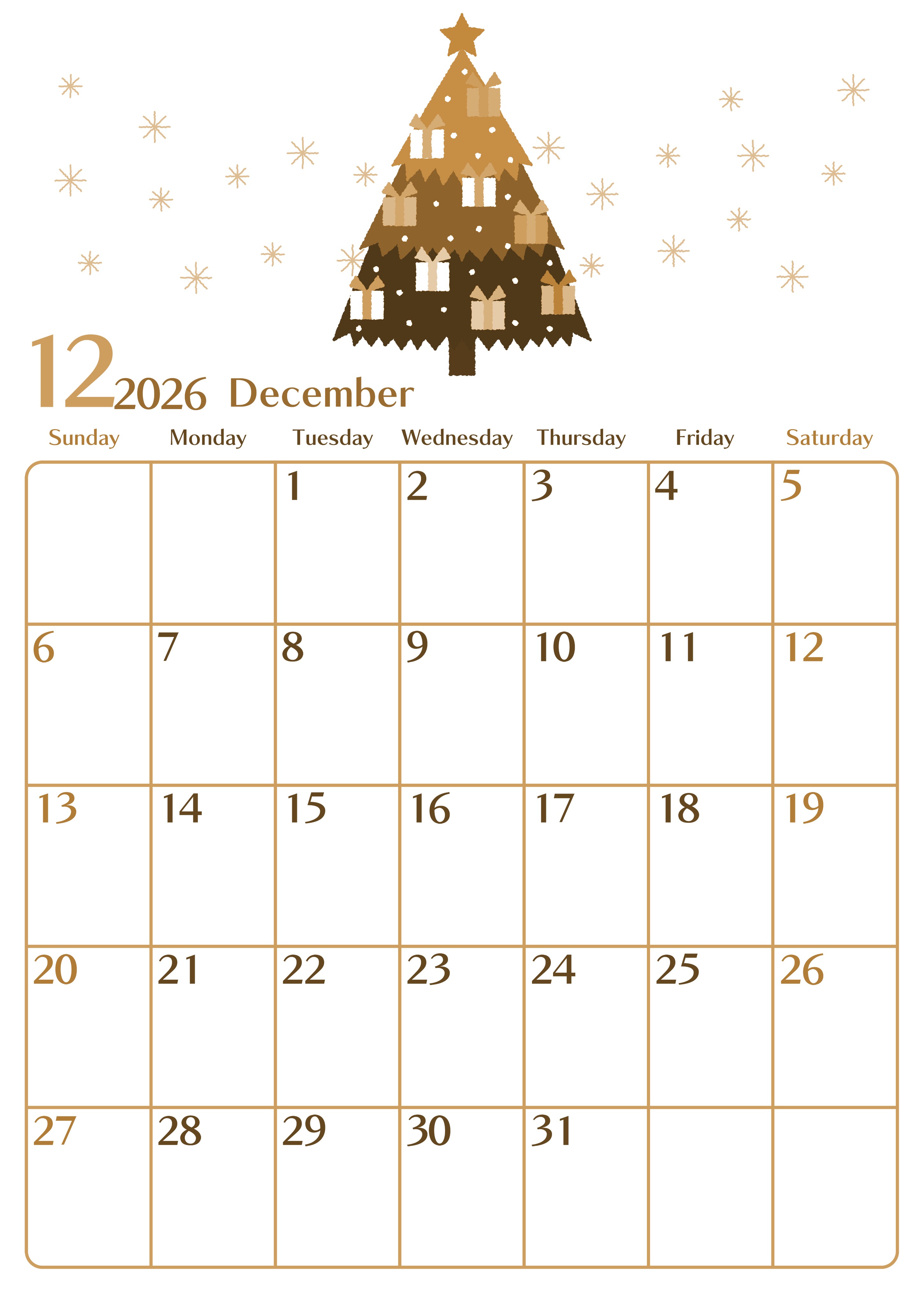 2026年12月縦型レトロな日曜始まりの無料テンプレートセピア調カレンダーです。クリスマスのワクワク感をテーマに取り上げたクリスマスツリーのイラストがおとなっぽくておしゃれな年末の予定を立てるのが楽しくなるセピア調カレンダーフリー素材です。(2026-00731210)