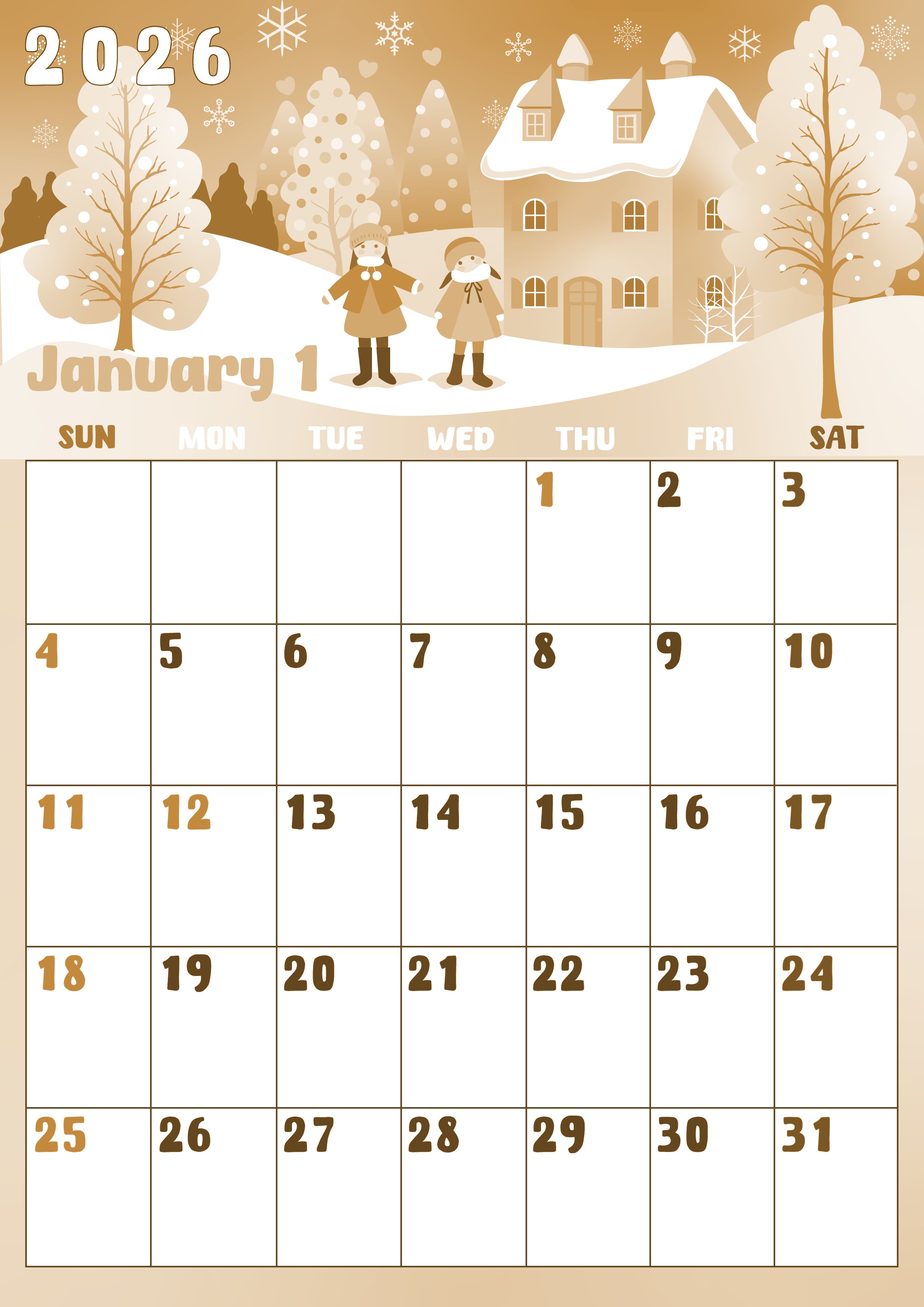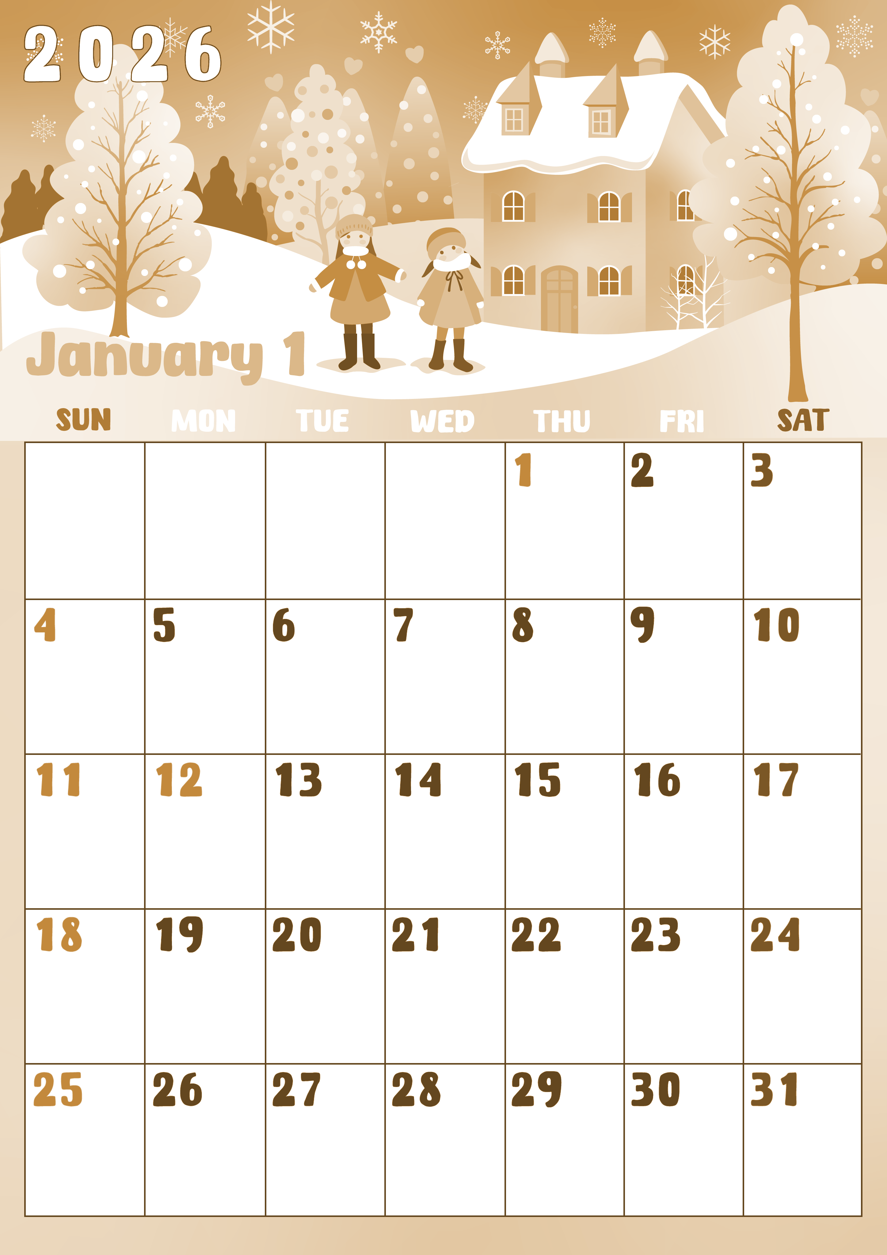 2026年・無料のカレンダーテンプレート 2026年1月縦型レトロな日曜始まり イラストのかわいいA4無料セピア調カレンダー(2026-00740110) 素材状デザイン王 2025年4月2日 2026年1月縦型レトロな日曜始まりの無料テンプレートセピア調カレンダーです。あけましておめでとうな明るい気持ちになるようなかわいいカレンダーとなっています。(2026-00740110) 1月 縦型のカレンダー 日曜始まり セピア カレンダーデザイン-0074