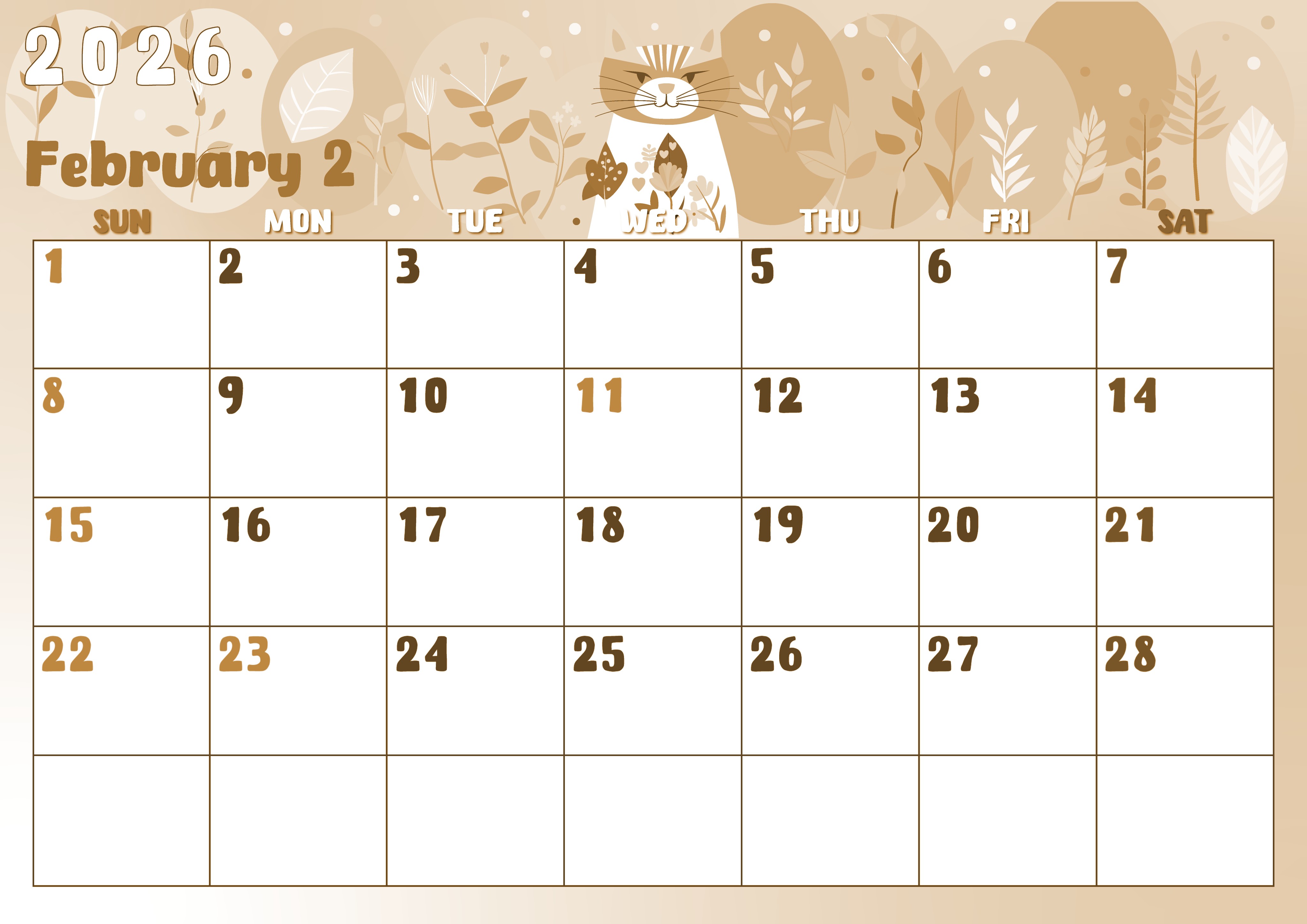 2026年2月横型レトロな日曜始まりの無料テンプレートセピア調カレンダーです。細かい所までイラストをしっかり描き込んだデザインで中央にかわいい猫がちょこんと座ってまっすぐこちらを見ています。(2026-00740200)