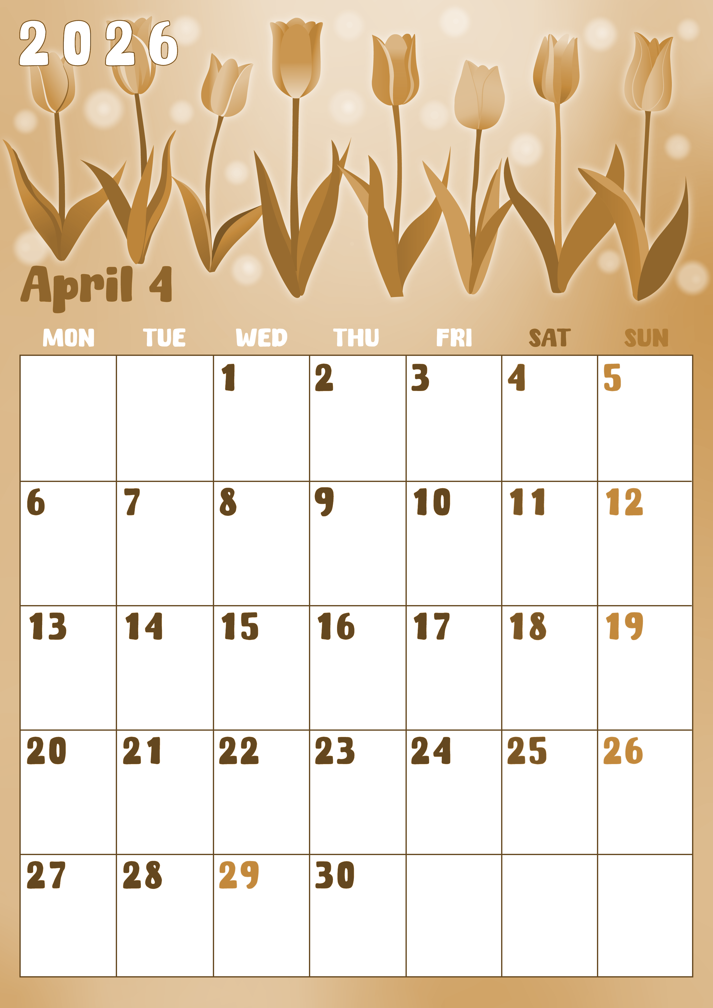 2026年4月縦型レトロな月曜始まりの無料テンプレートセピア調カレンダーです。春の生き生きした雰囲気を後押ししているかわいいチューリップをテーマにしたイラストがプランニングを楽しませてくれるようなセピア調カレンダーです。(2026-00740411)