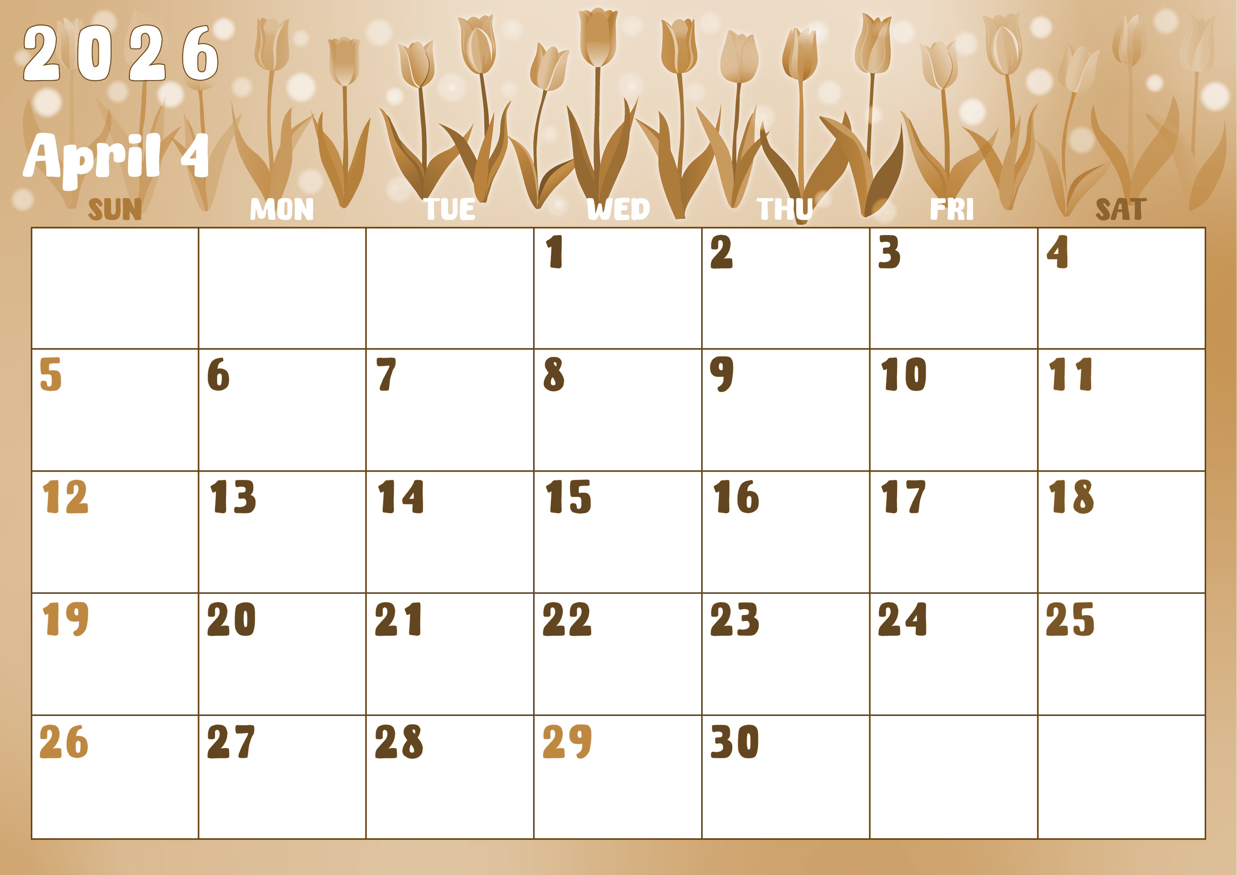 2026年・無料のカレンダーテンプレート 2026年4月横型レトロな日曜始まり チューリップイラストのかわいいA4無料セピア調カレンダー(2026-00740400) 素材状デザイン王 2025年4月2日 2026年4月横型レトロな日曜始まりの無料テンプレートセピア調カレンダーです。背景ににょきにょきと生命力豊かに成長しているチューリップの花々がかわいいイラストが映えるデザインとなっています。(2026-00740400) 4月 横型のカレンダー 日曜始まり セピア カレンダーデザイン-0074