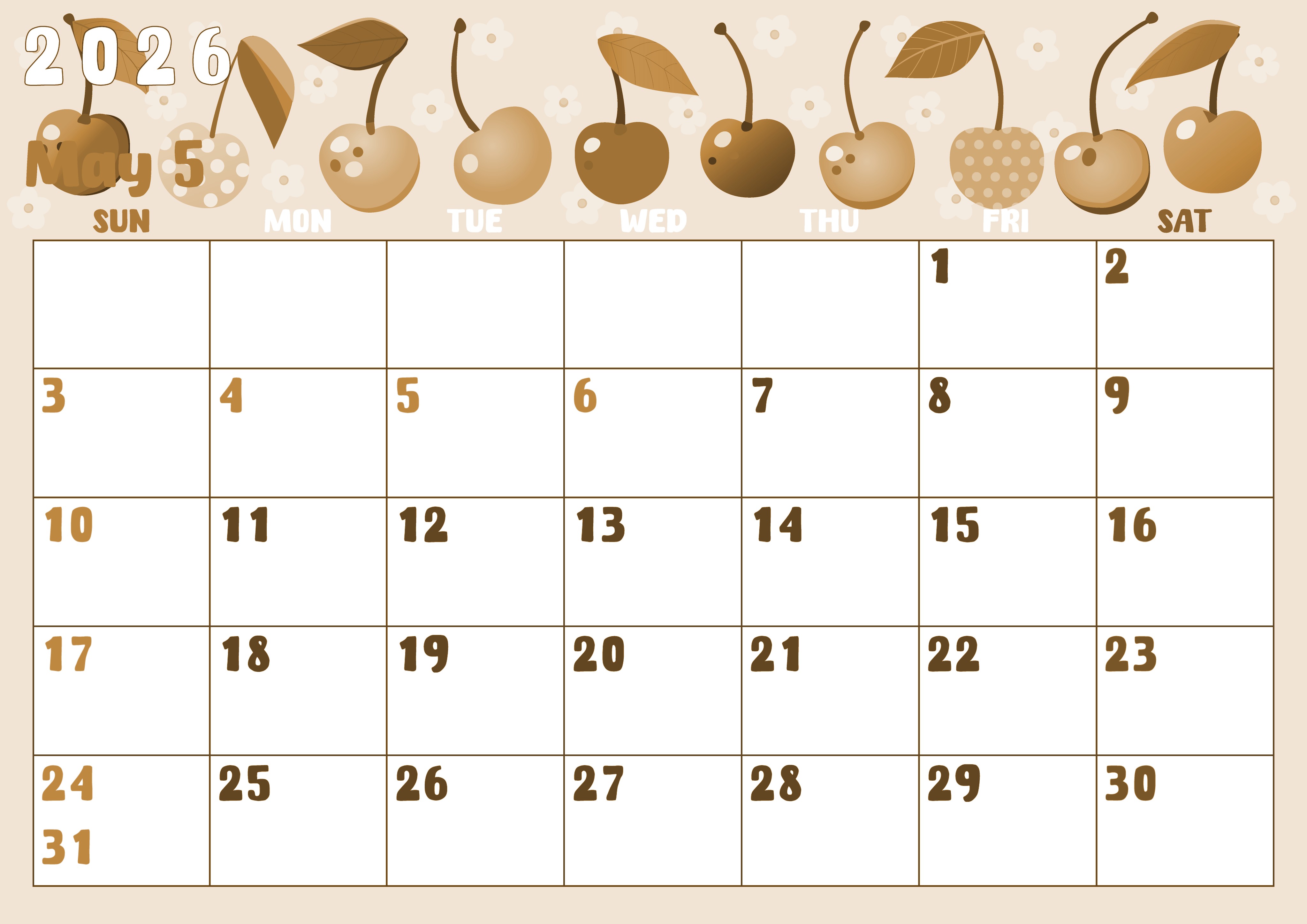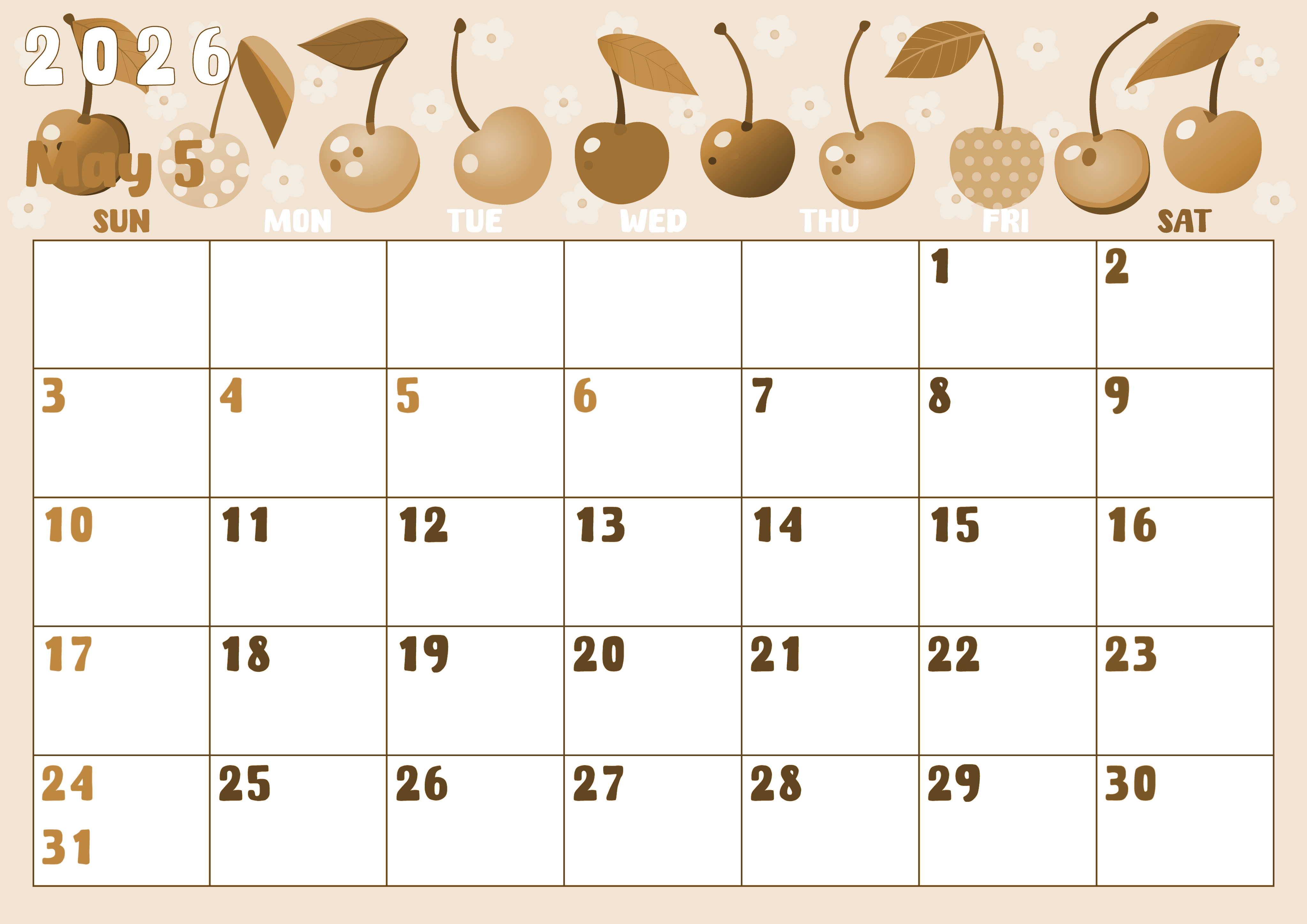 2026年・無料のカレンダーテンプレート 2026年5月横型レトロな日曜始まり サクランボイラストのかわいいA4無料セピア調カレンダー(2026-00740500) 素材状デザイン王 2025年4月2日 2026年5月横型レトロな日曜始まりの無料テンプレートセピア調カレンダーです。背景に様々なプルッとしたみずみずしいサクランボのイラストが女の子らしくてかわいいフリー素材です。(2026-00740500) 5月 横型のカレンダー 日曜始まり セピア カレンダーデザイン-0074