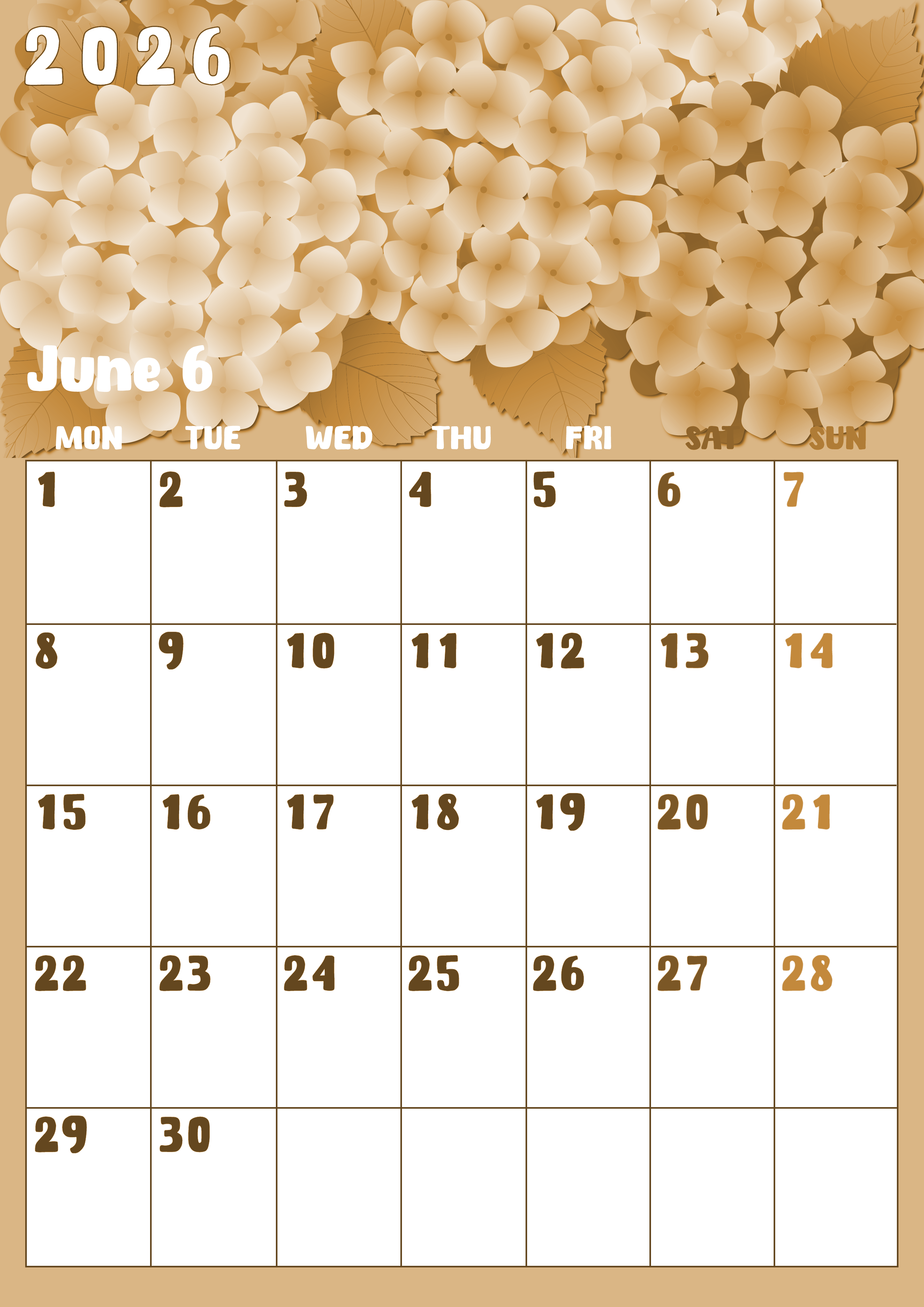 2026年・無料のカレンダーテンプレート 2026年6月縦型レトロな月曜始まり アジサイイラストのかわいいA4無料セピア調カレンダー(2026-00740611) 素材状デザイン王 2025年4月2日 2026年6月縦型レトロな月曜始まりの無料テンプレートセピア調カレンダーです。みずみずしく大きなアジサイがしきつめられている生命力を感じさせてくれるかわいいイラスト素材です。(2026-00740611) 6月 縦型のカレンダー 月曜始まり セピア カレンダーデザイン-0074