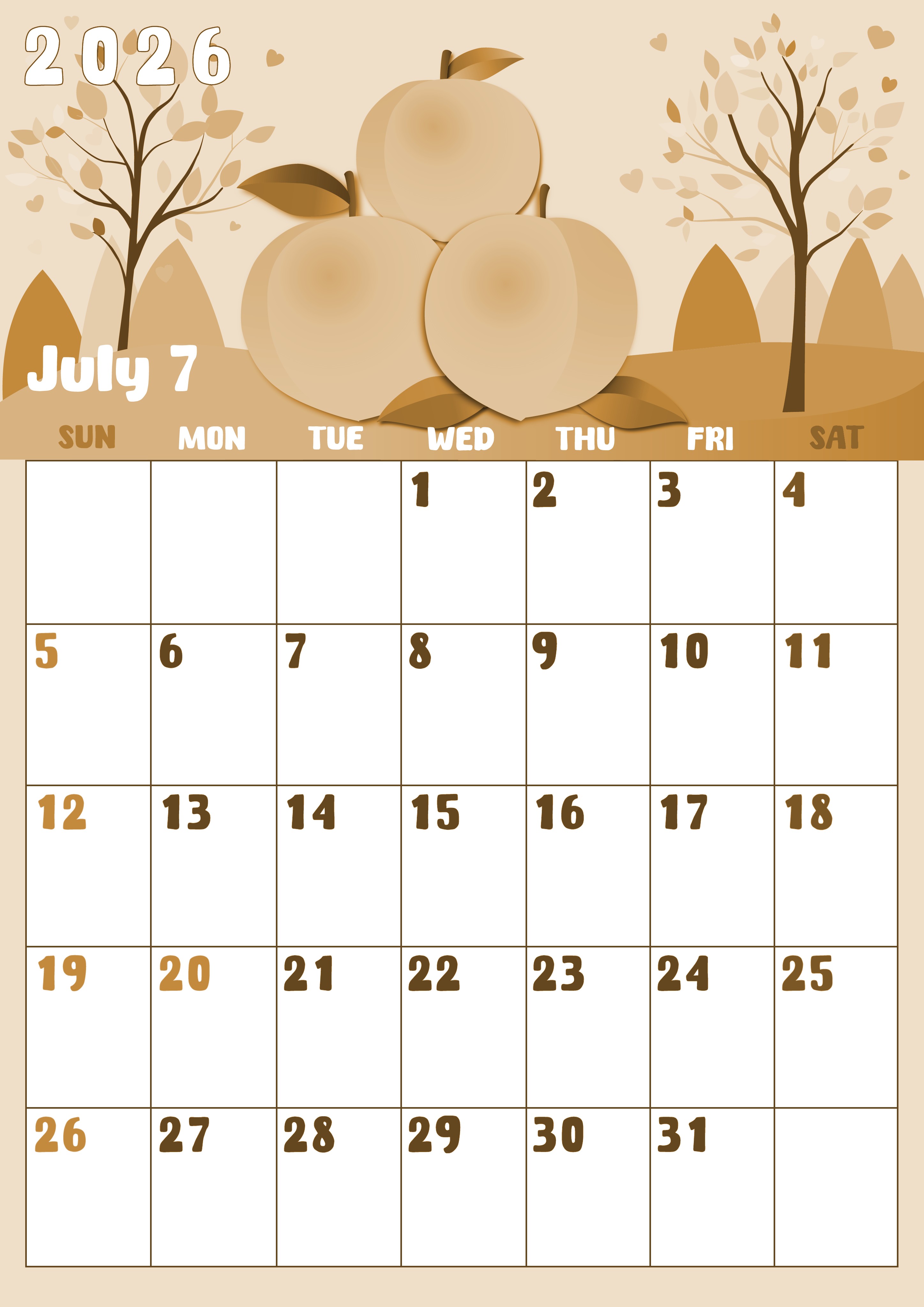2026年7月縦型レトロな日曜始まりの無料テンプレートセピア調カレンダーです。桃の生き生きとした様子に元気をもらえるようなかわいいイラストが目の保養になります。縦型なので壁に貼っていつでも見れるようにしておくと予定を忘れる事も防げます。(2026-00740710)