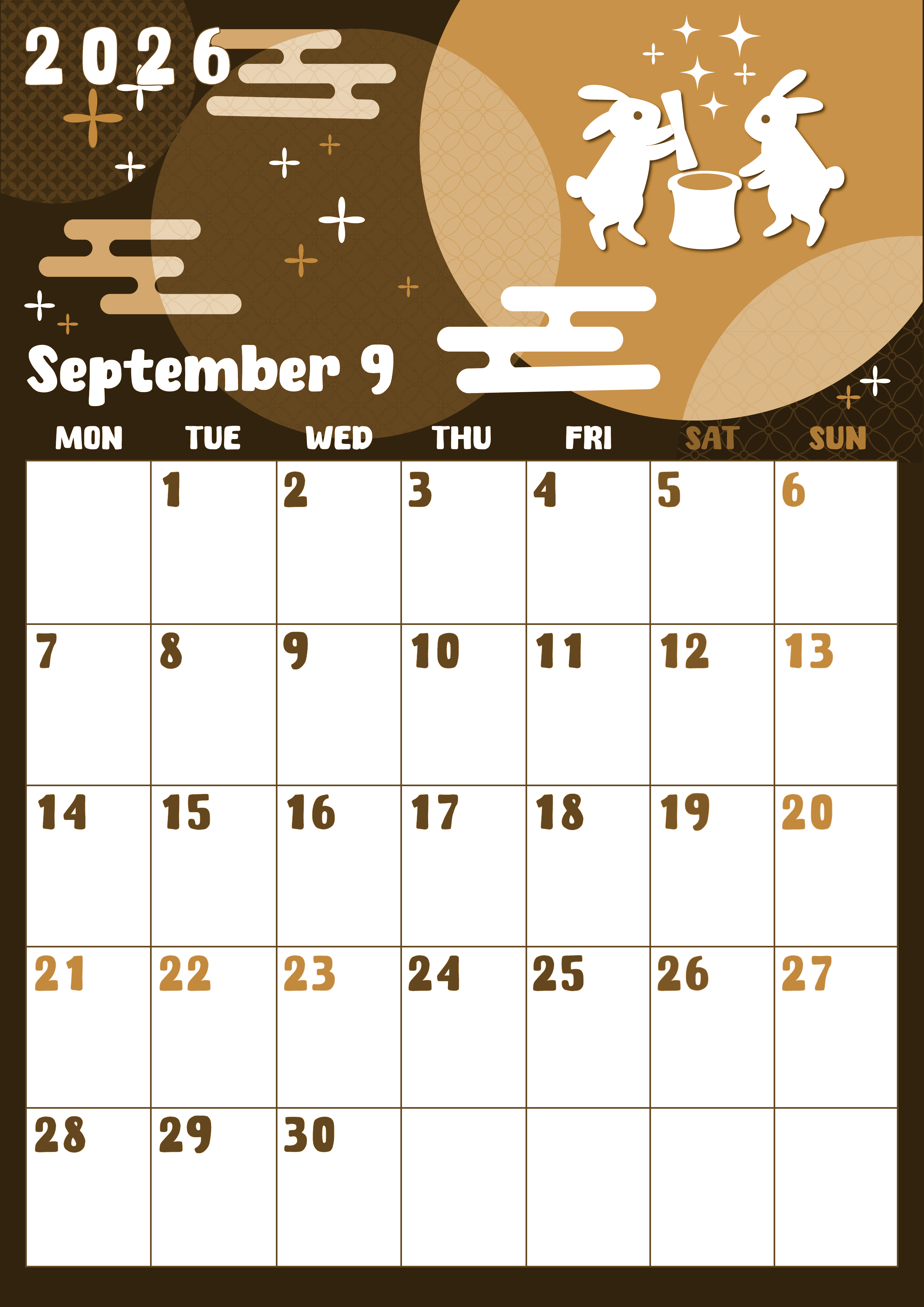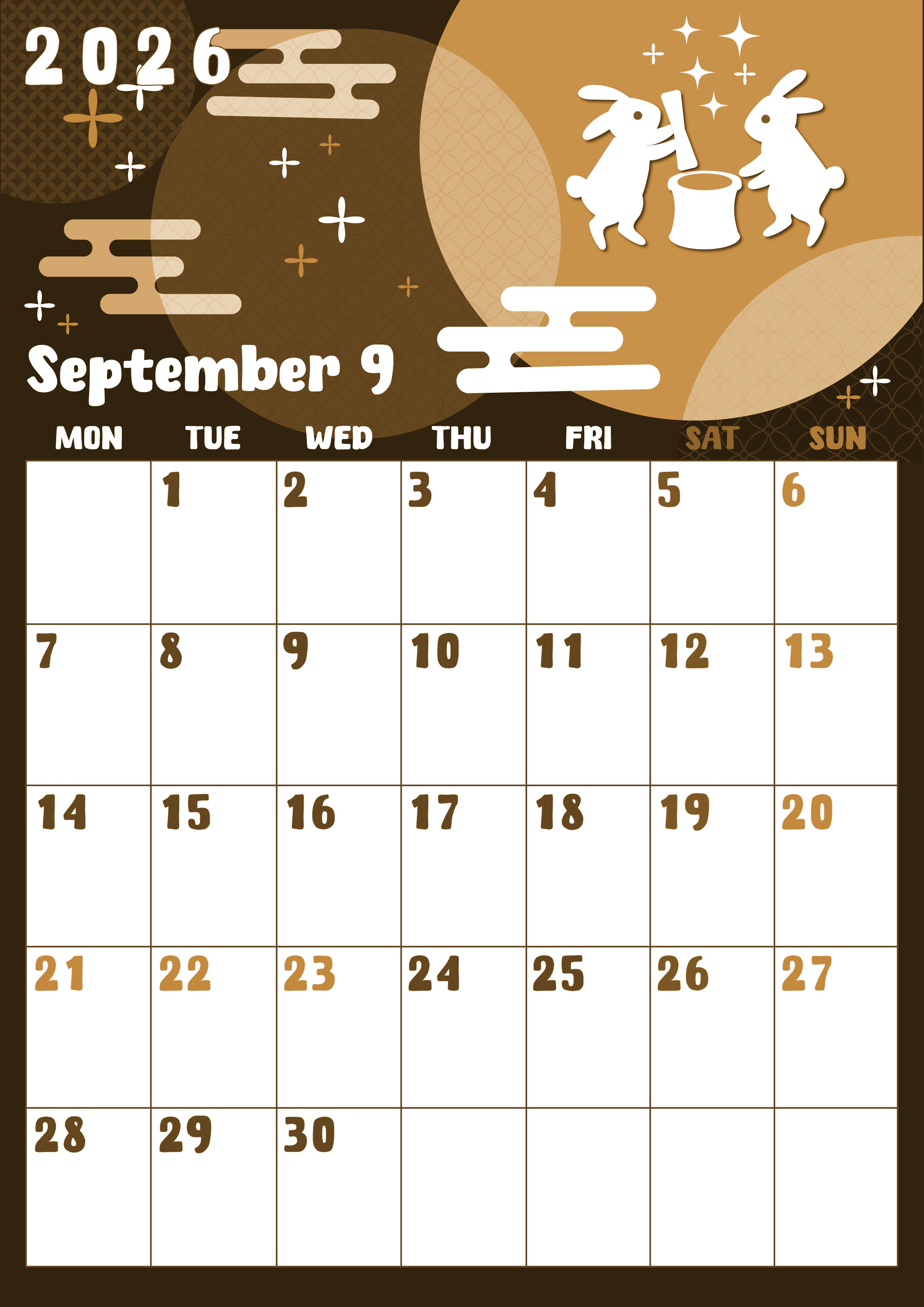 2026年9月縦型レトロな月曜始まりの無料テンプレートセピア調カレンダーです。協力をして交互におもちをぺったんぺったんと餅つきをしているかわいいうさぎのイラストがかわいいです。A4用紙に印刷をして使えるフリー素材となっています。(2026-00740911)