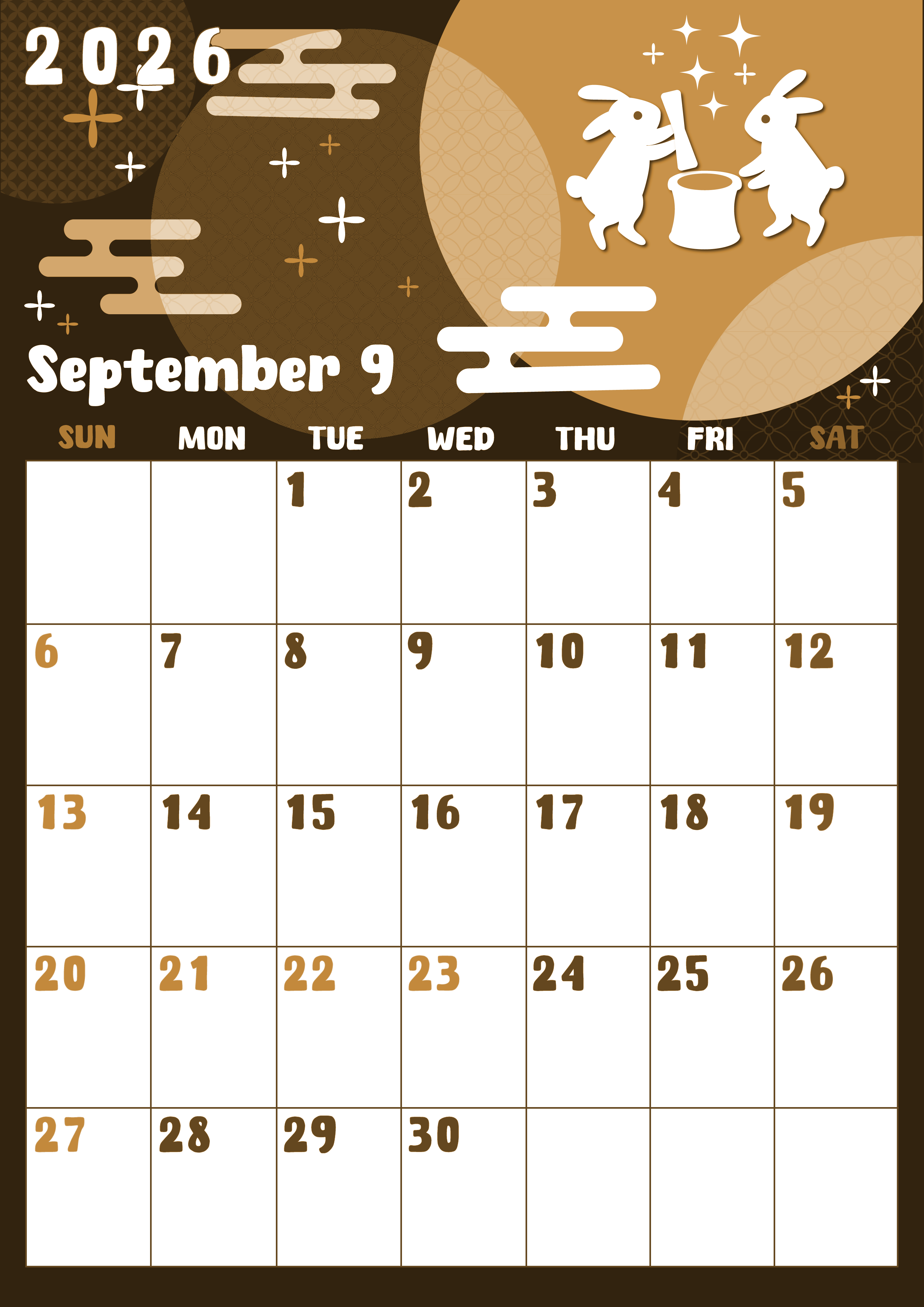 2026年9月縦型レトロな日曜始まりの無料テンプレートセピア調カレンダーです。十五夜をテーマにしたうさぎのイラストがかわいいセピア調カレンダー部分の書き込みのしやすさもおすすめポイントとなっているフリー素材です。(2026-00740910)
