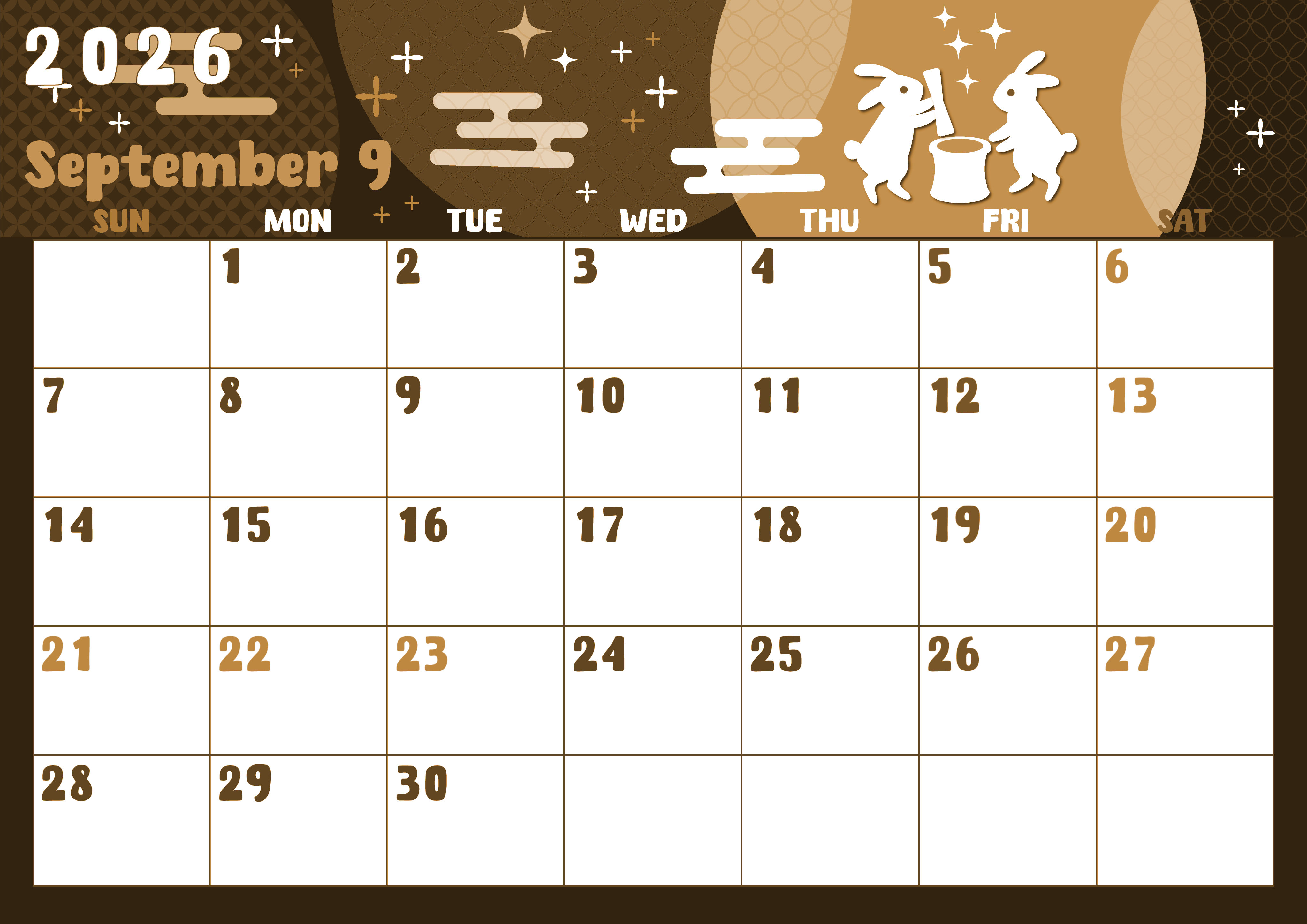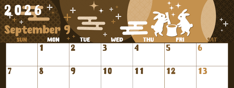 2026年・無料のカレンダーテンプレート 2026年9月横型レトロな日曜始まり うさぎイラストのかわいいA4無料セピア調カレンダー(2026-00740900) 素材状デザイン王 2025年4月2日 2025.12.21 2026年9月横型レトロな日曜始まりの無料テンプレートセピア調カレンダーです。満月を背景に白いカップルのうさぎさんが一生懸命餅つきをしている様子がとってもかわいいイラストが魅力的なフリー素材です。(2026-00740900) 9月 横型のカレンダー 日曜始まり セピア カレンダーデザイン-0074