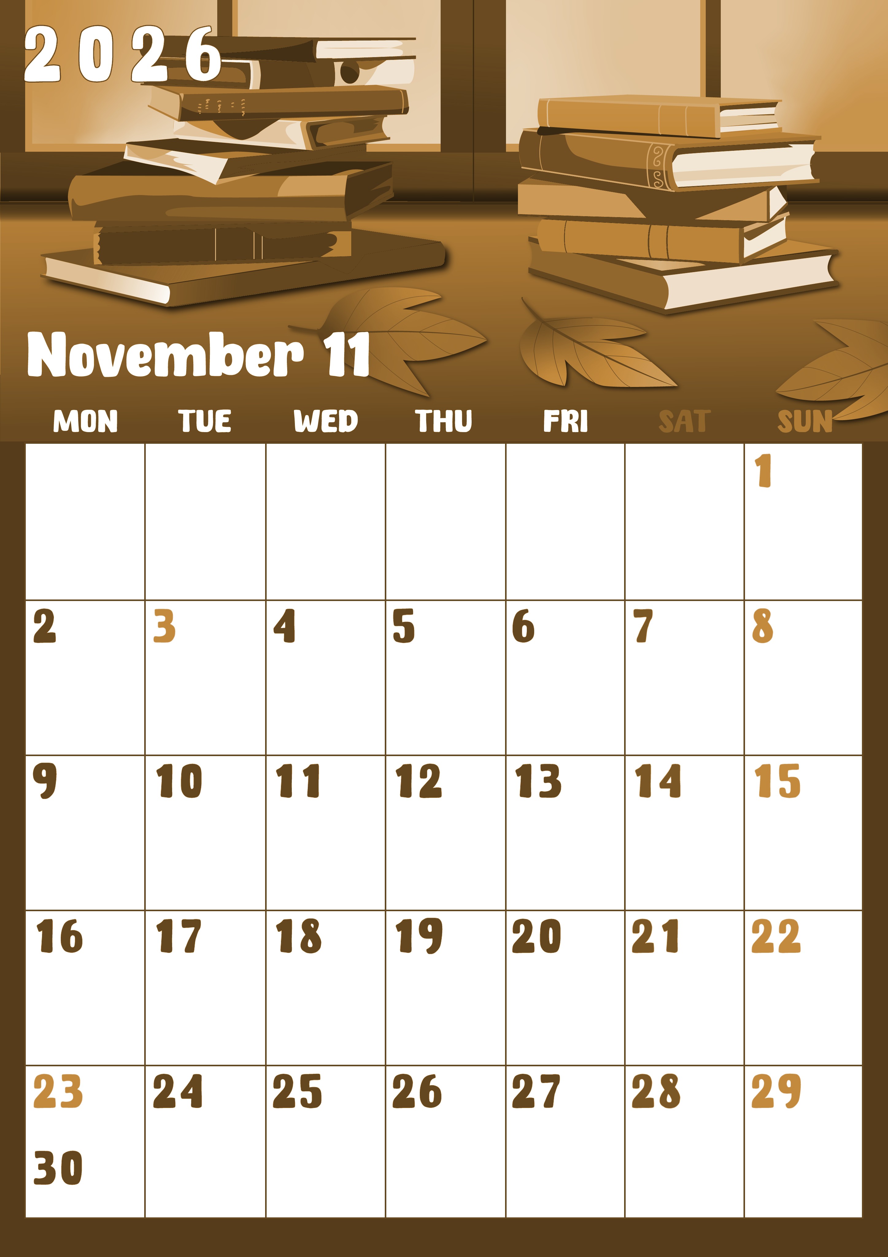 2026年11月縦型レトロな月曜始まりの無料テンプレートセピア調カレンダーです。文字がぷっくりとしていてかわいいセピア調カレンダーです。予定を記入するエリアは背景が白色なので書き込みがしやすい利便性の高いフリー素材となっています。本のイラストもポイントです。(2026-00741111)