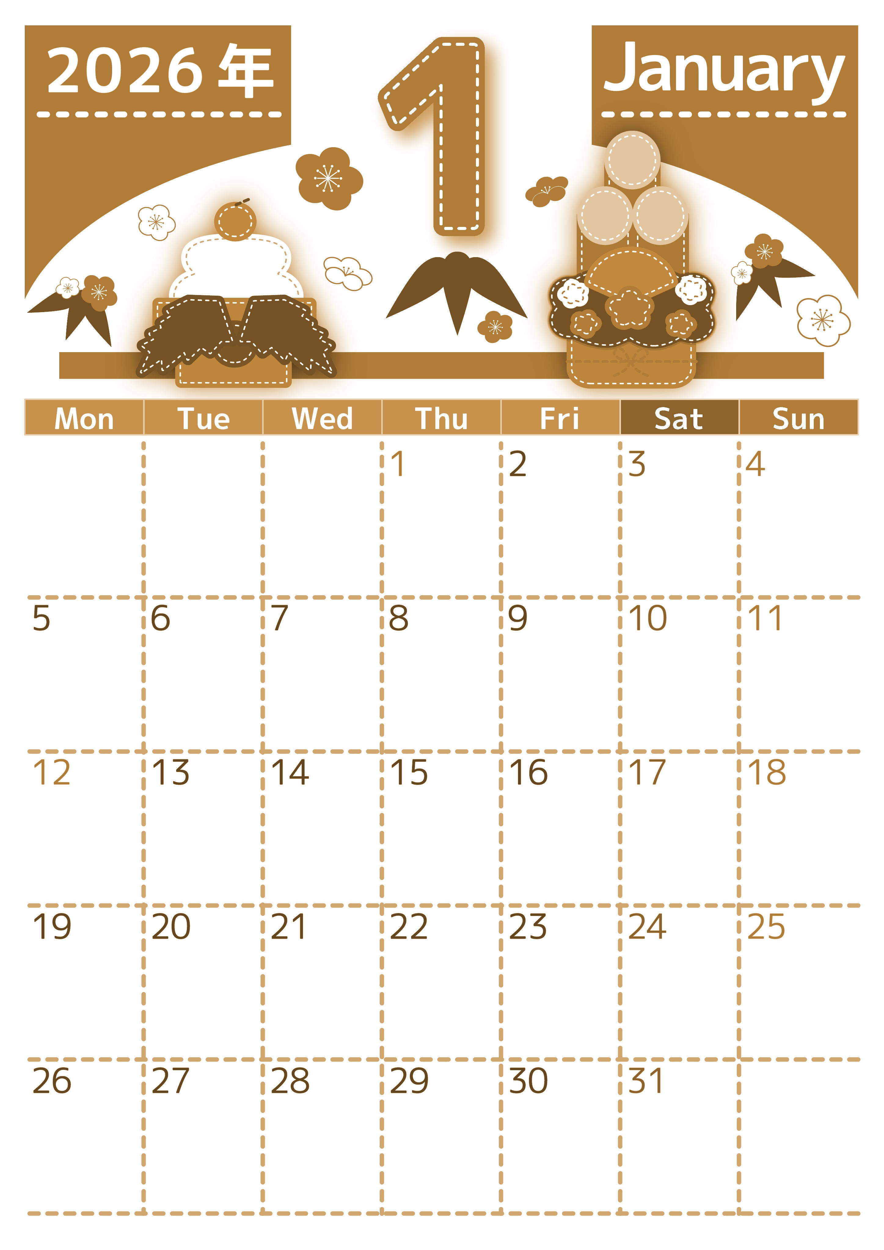 2026年・無料のカレンダーテンプレート 2026年1月縦型レトロな月曜始まり イラストのかわいいA4無料セピア調カレンダー(2026-00750111) 素材状デザイン王 2025年4月2日 2026年1月縦型レトロな月曜始まりの無料テンプレートセピア調カレンダーです。心を新たに新年のスタートダッシュを切るのにふさわしい計画を立てやすいかわいいイラストカレンダーです。(2026-00750111) 1月 縦型のカレンダー 月曜始まり セピア カレンダーデザイン-0075