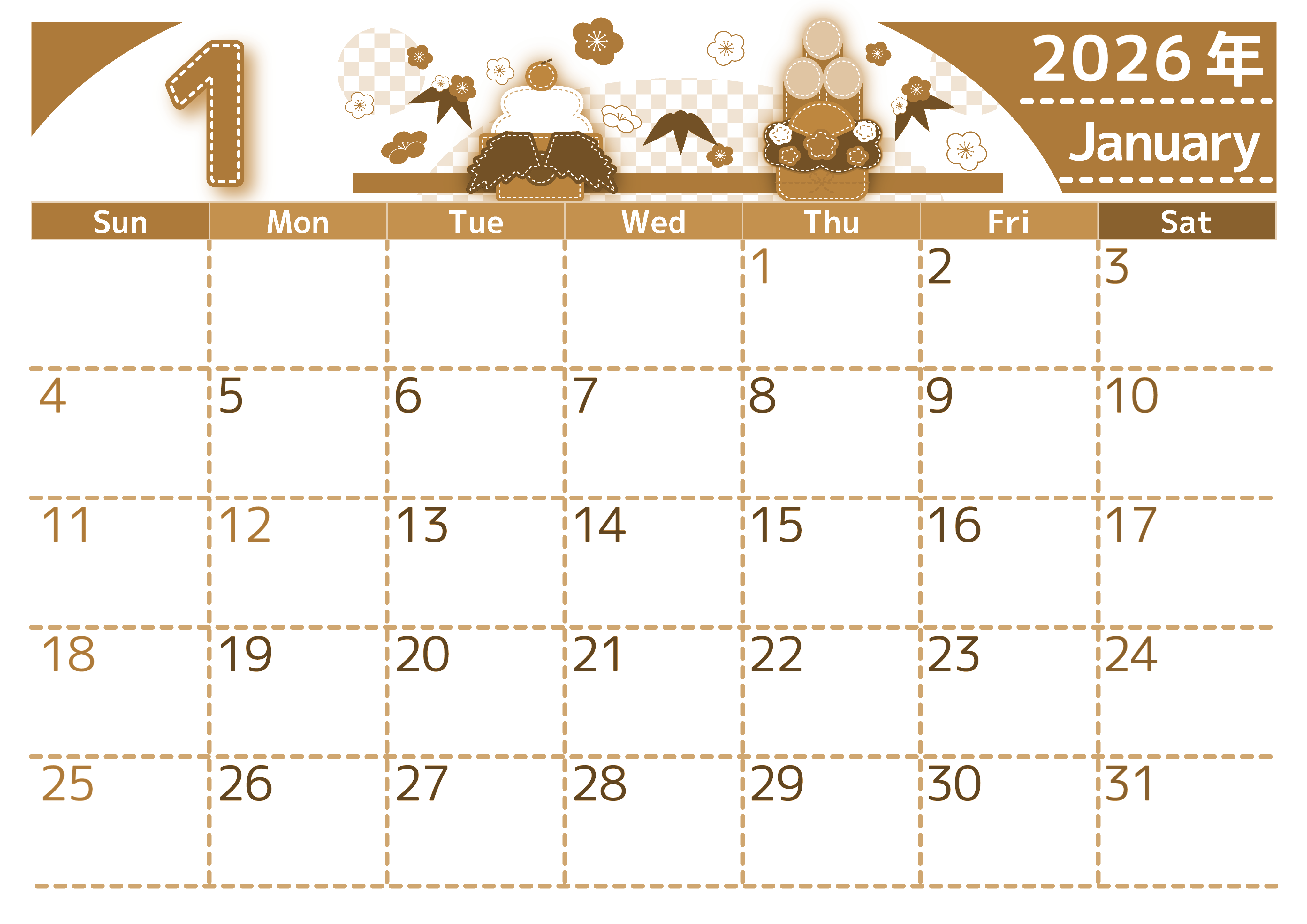 2026年1月横型レトロな日曜始まりの無料テンプレートセピア調カレンダーです。パッチワークのようなかわいい雰囲気でお正月ムードのイラストが元気よく描かれたポップさが特徴です。切り取り線風な線がかわいいです。(2026-00750100)