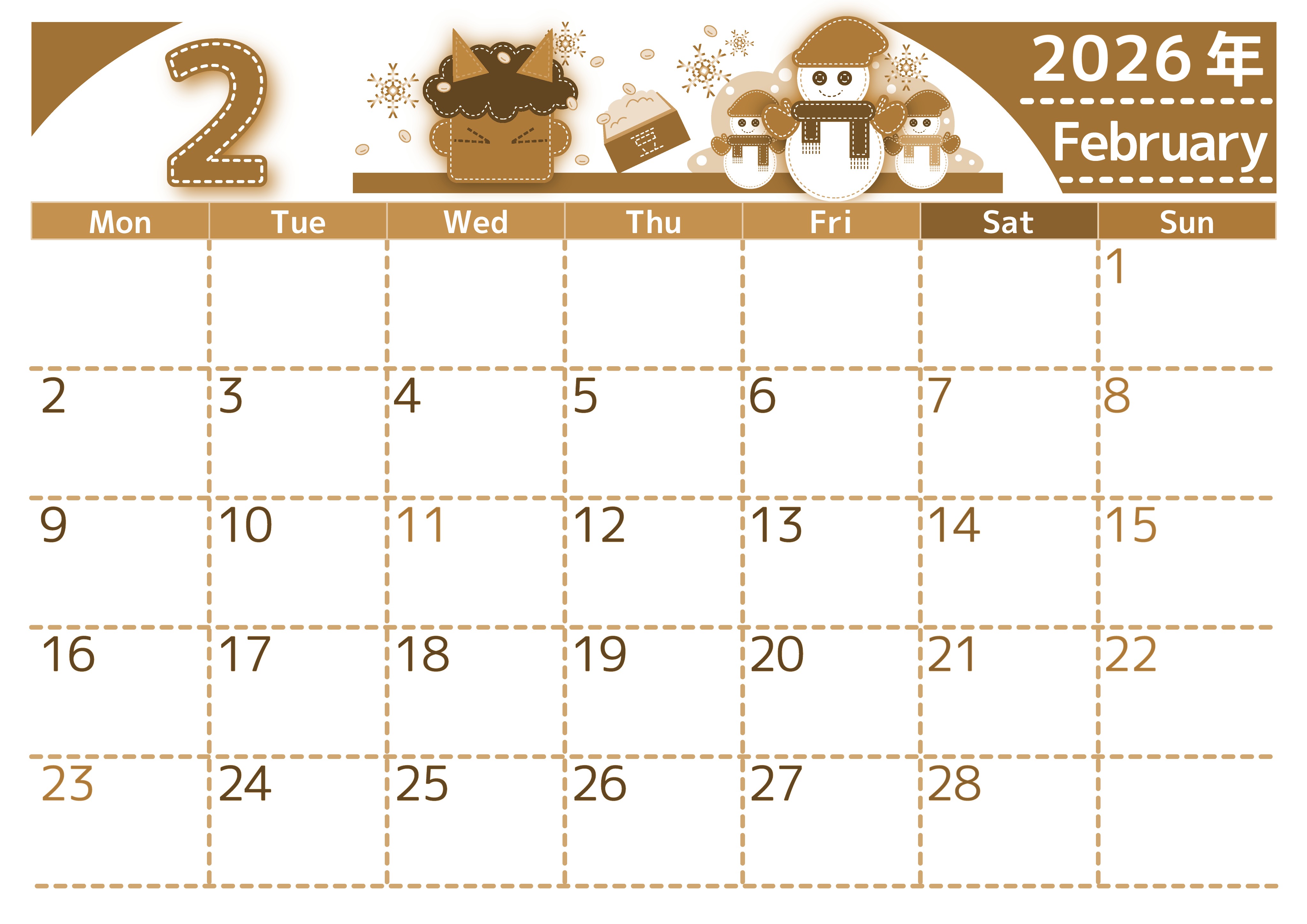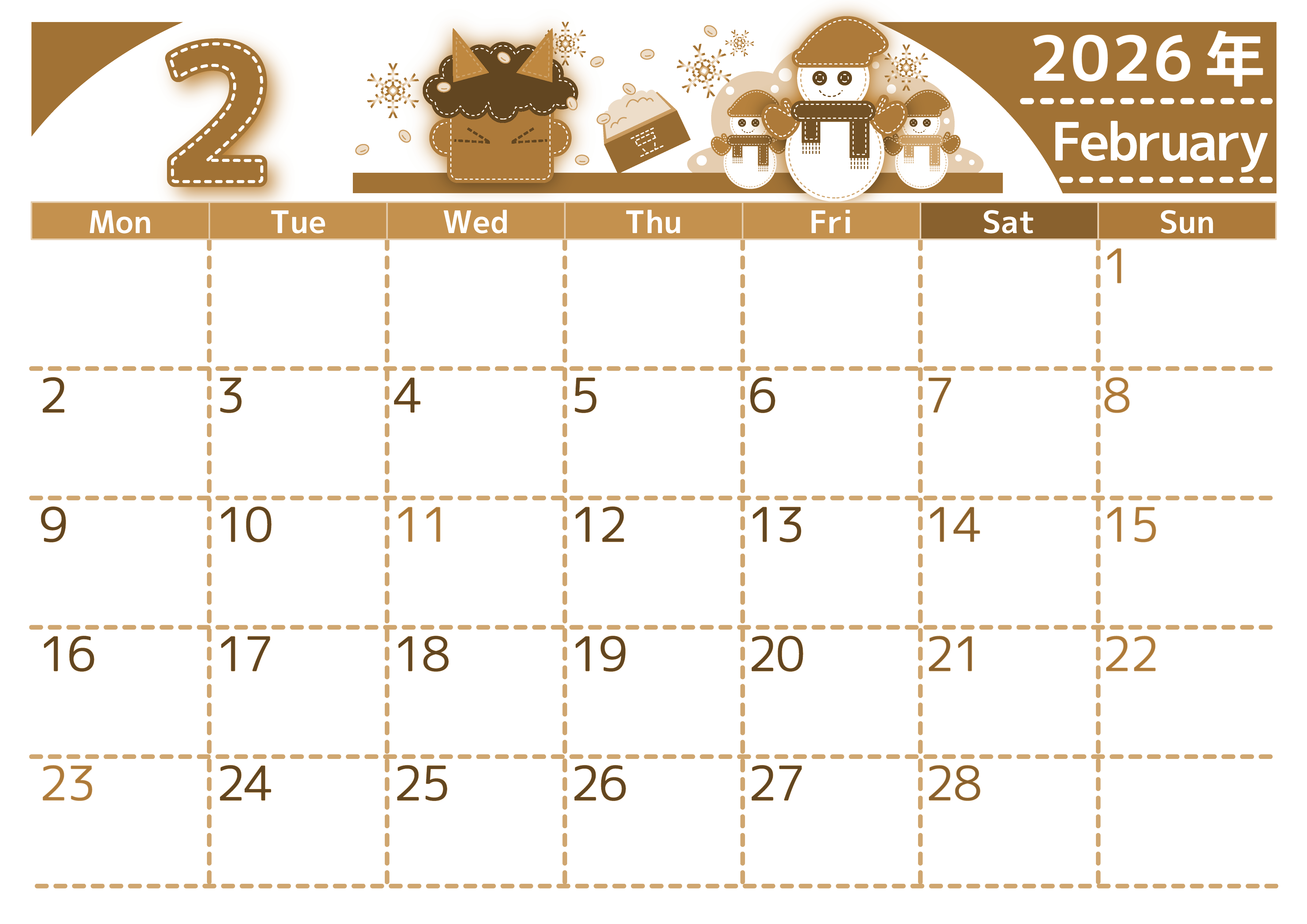 2026年2月横型レトロな月曜始まり イラストのかわいいA4無料セピア調カレンダー(2026-00750201)