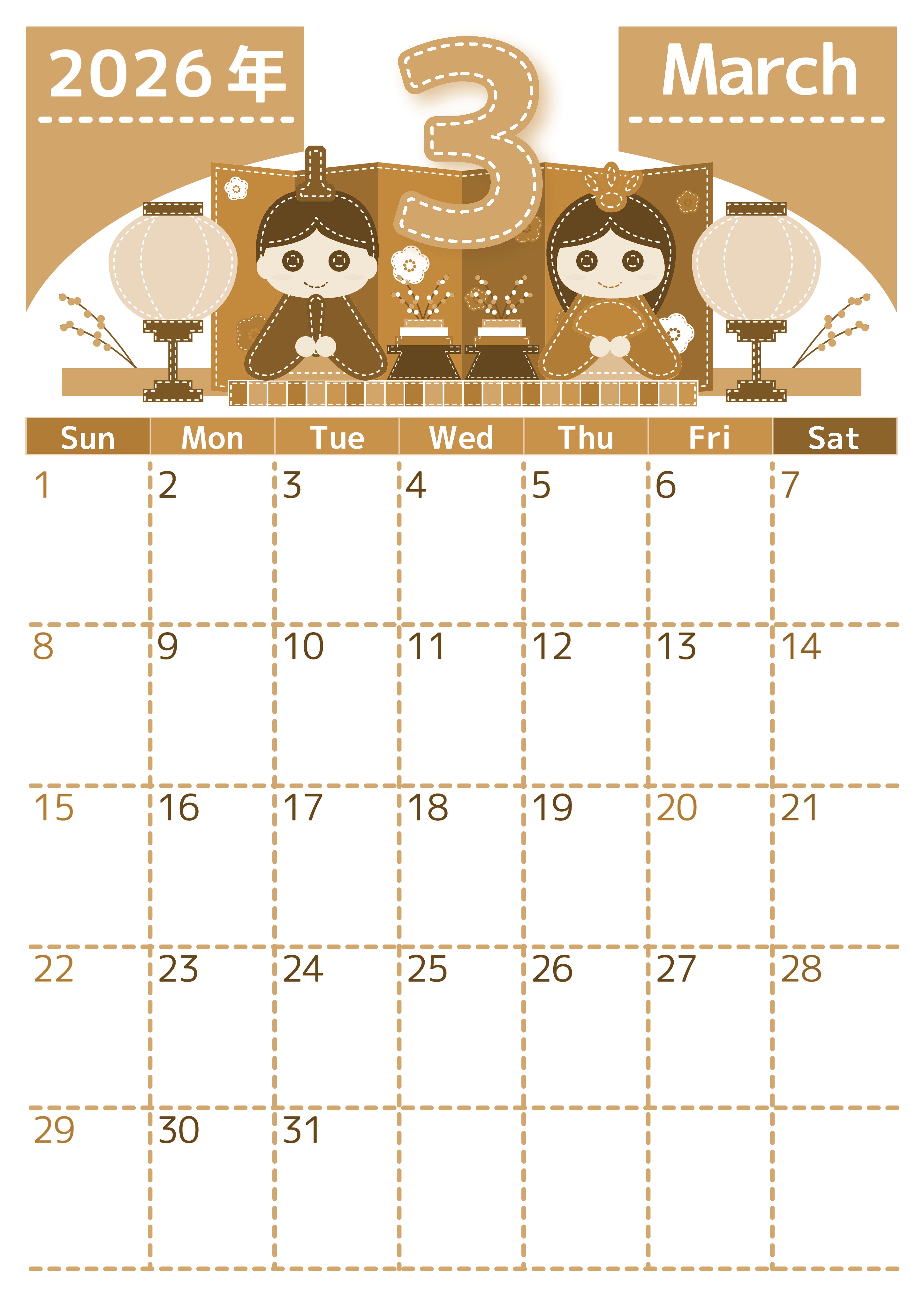 2026年3月縦型レトロな日曜始まりの無料テンプレートセピア調カレンダーです。イラスト部分だけでなくセピア調カレンダー部分の罫線もハンドメイド感があしらわれていて遊び心満載の使うのが楽しくなるようなかわいいデザインのフリー素材です。(2026-00750310)
