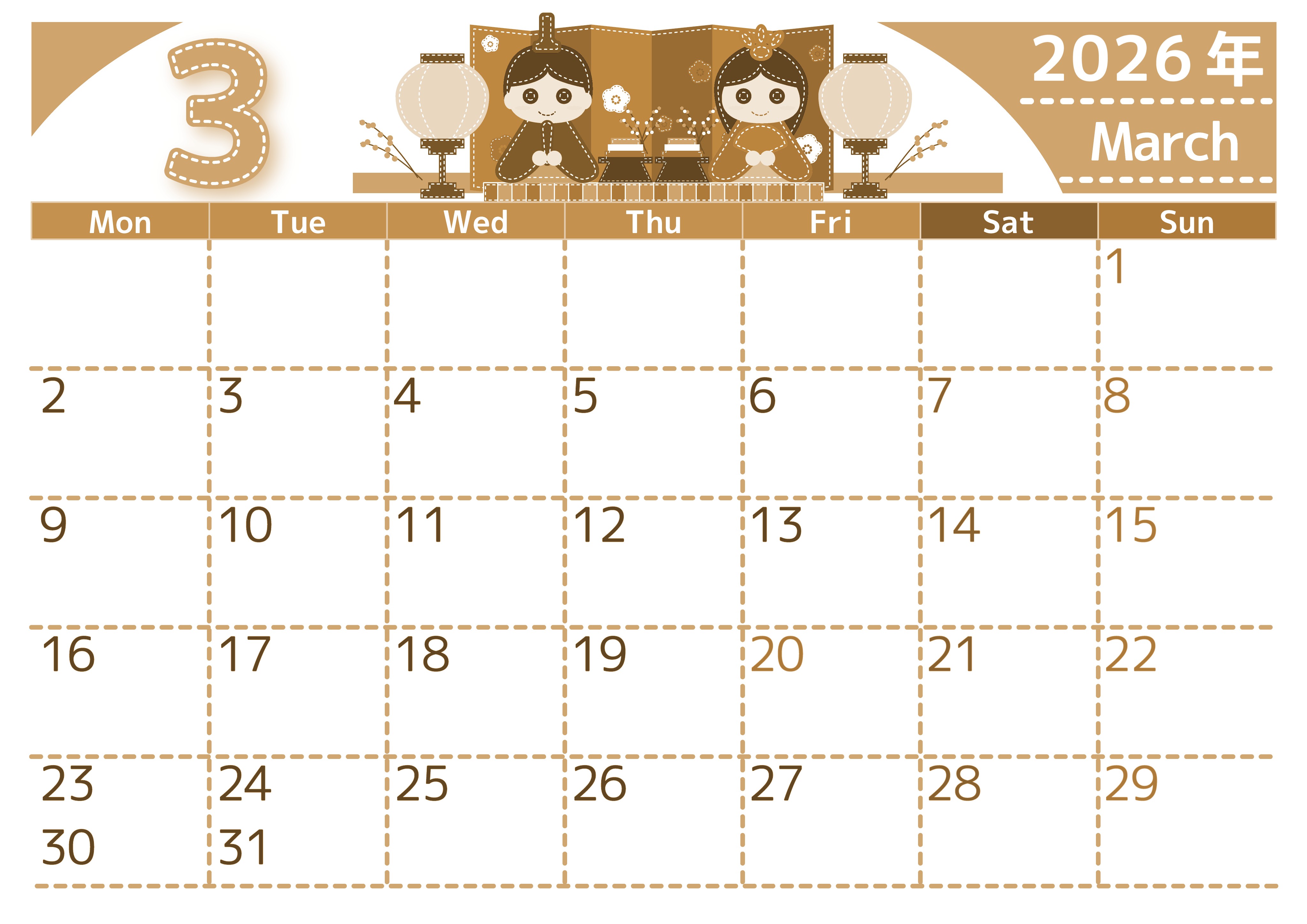 2026年3月横型レトロな月曜始まりの無料テンプレートセピア調カレンダーです。縫いしろの細部までこだわっているイラストがかわいいハッキリとした色合いが目を引く使いやすくて見やすいセピア調カレンダーフリー素材となっています。(2026-00750301)