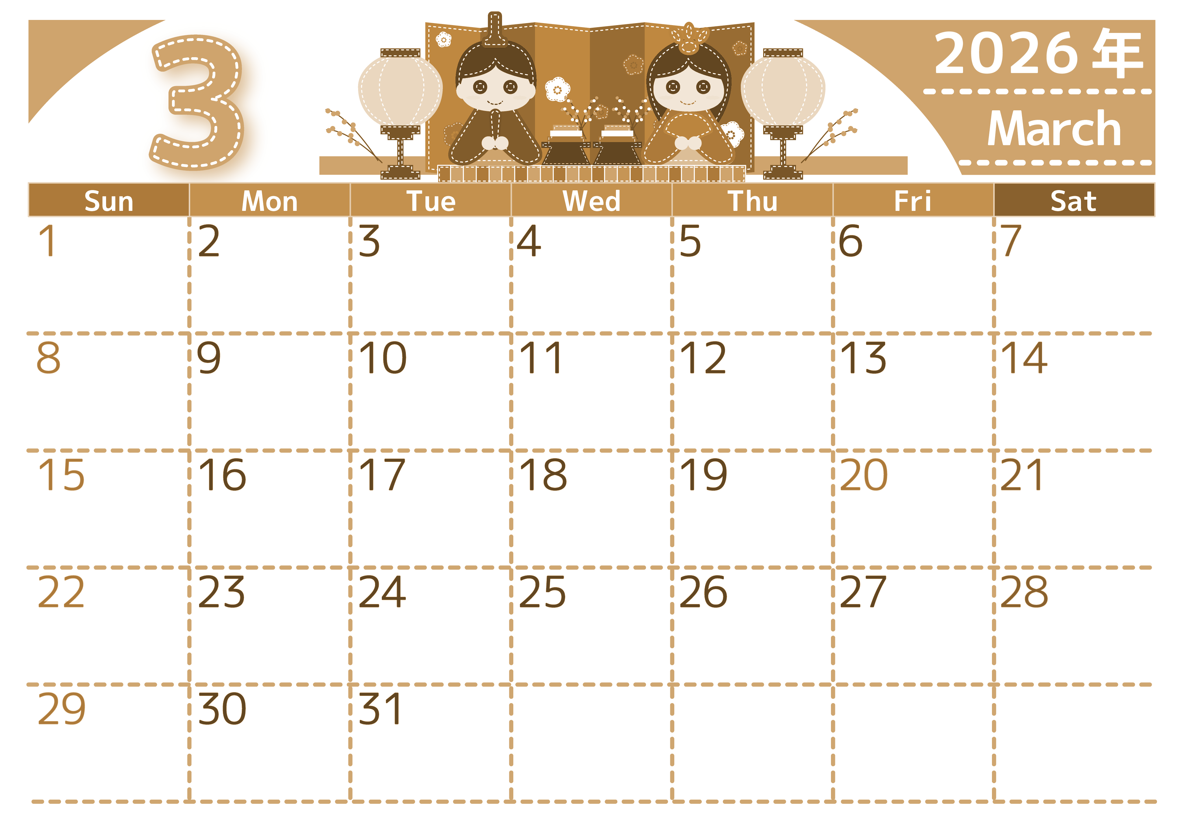 2026年3月横型レトロな日曜始まりの無料テンプレートセピア調カレンダーです。フェルト刺繍のようなハンドメイドテイストで描かれているひな祭りのカップルがとてもかわいい癒し系のイラストデザインとなっています。(2026-00750300)