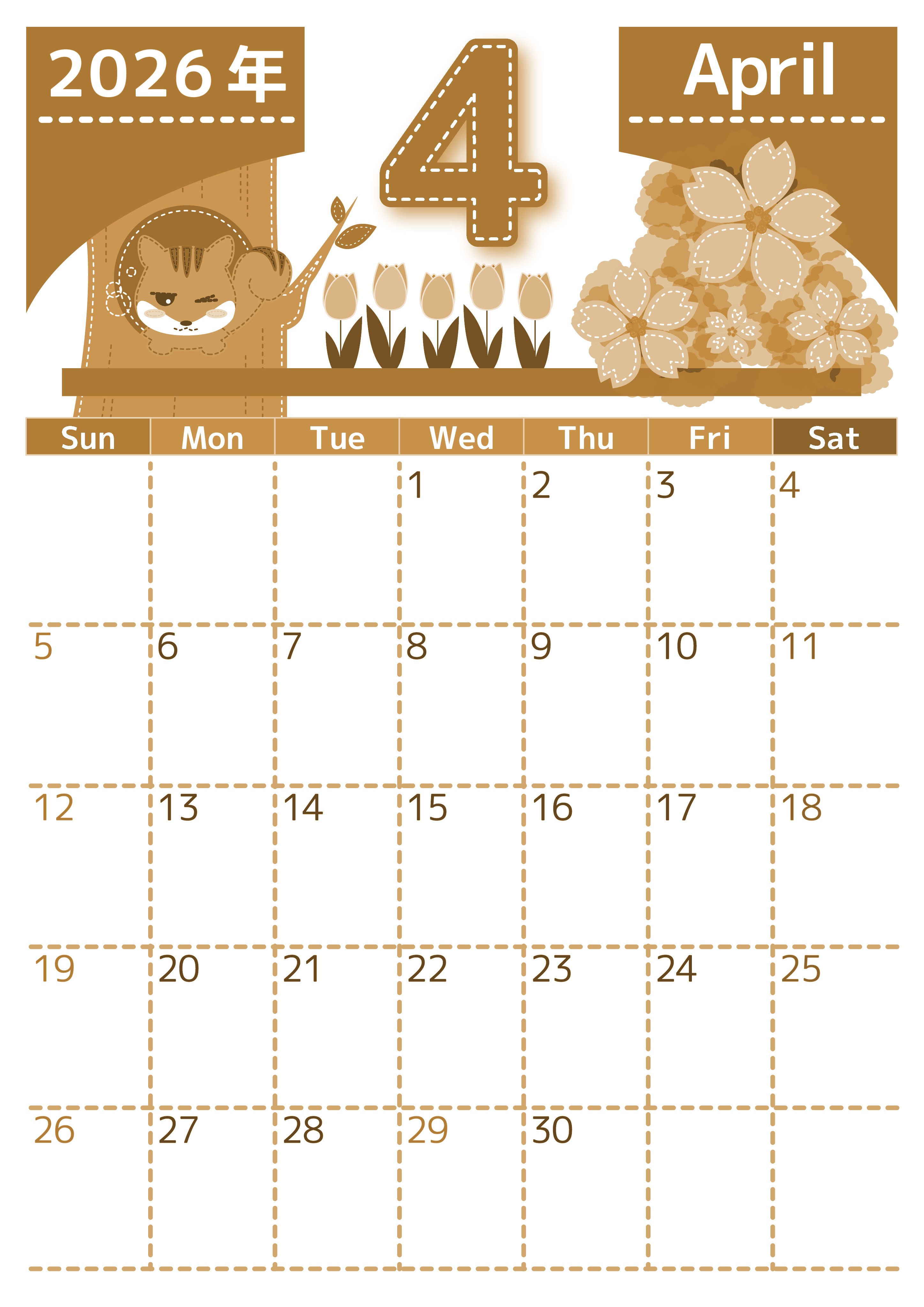 2026年4月縦型レトロな日曜始まりの無料テンプレートセピア調カレンダーです。元気づけてくれるようなかわいいリスのセピア調カレンダーなので壁に貼ってインテリアとしても一役買うようなデザインとなっています。(2026-00750410)