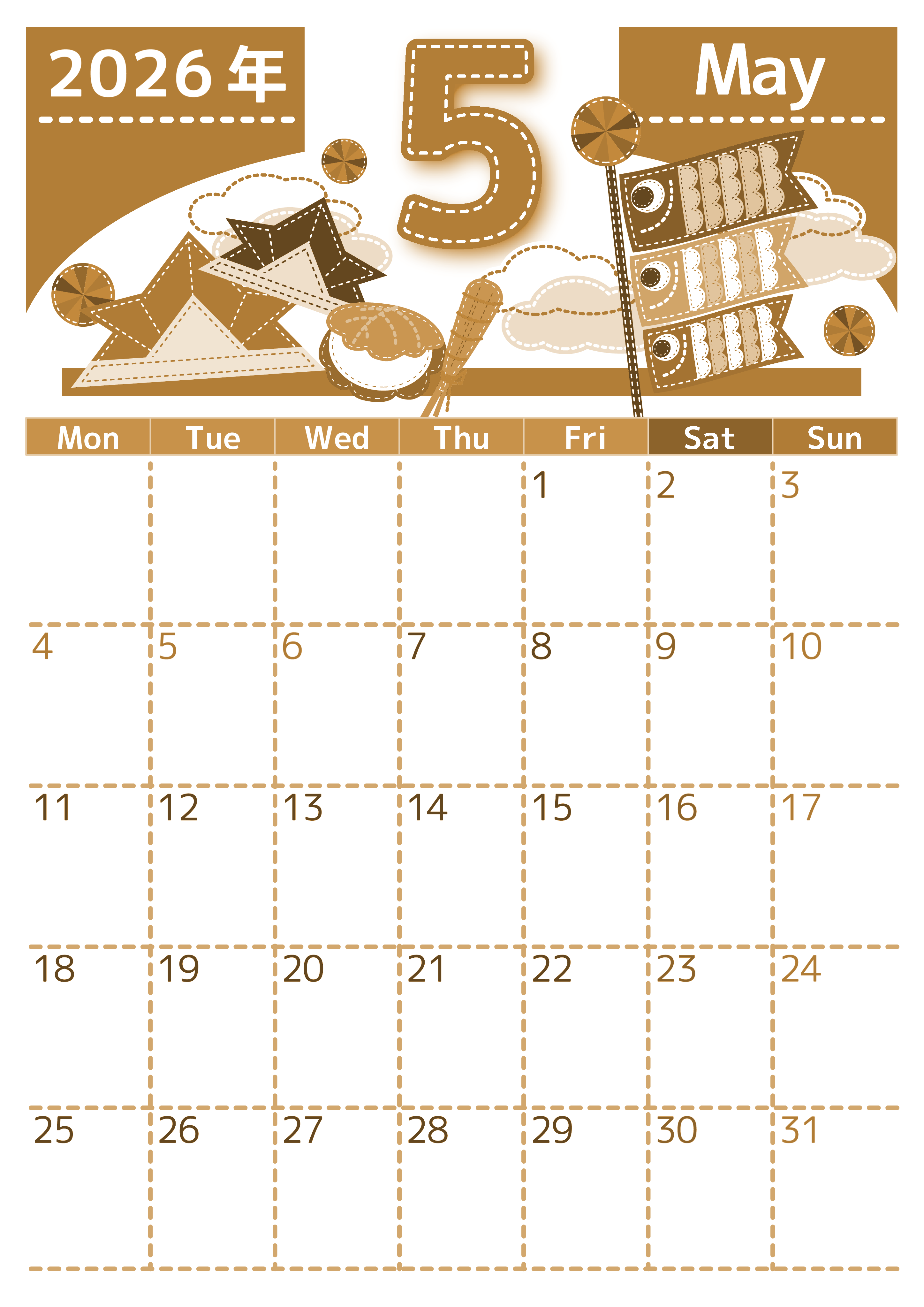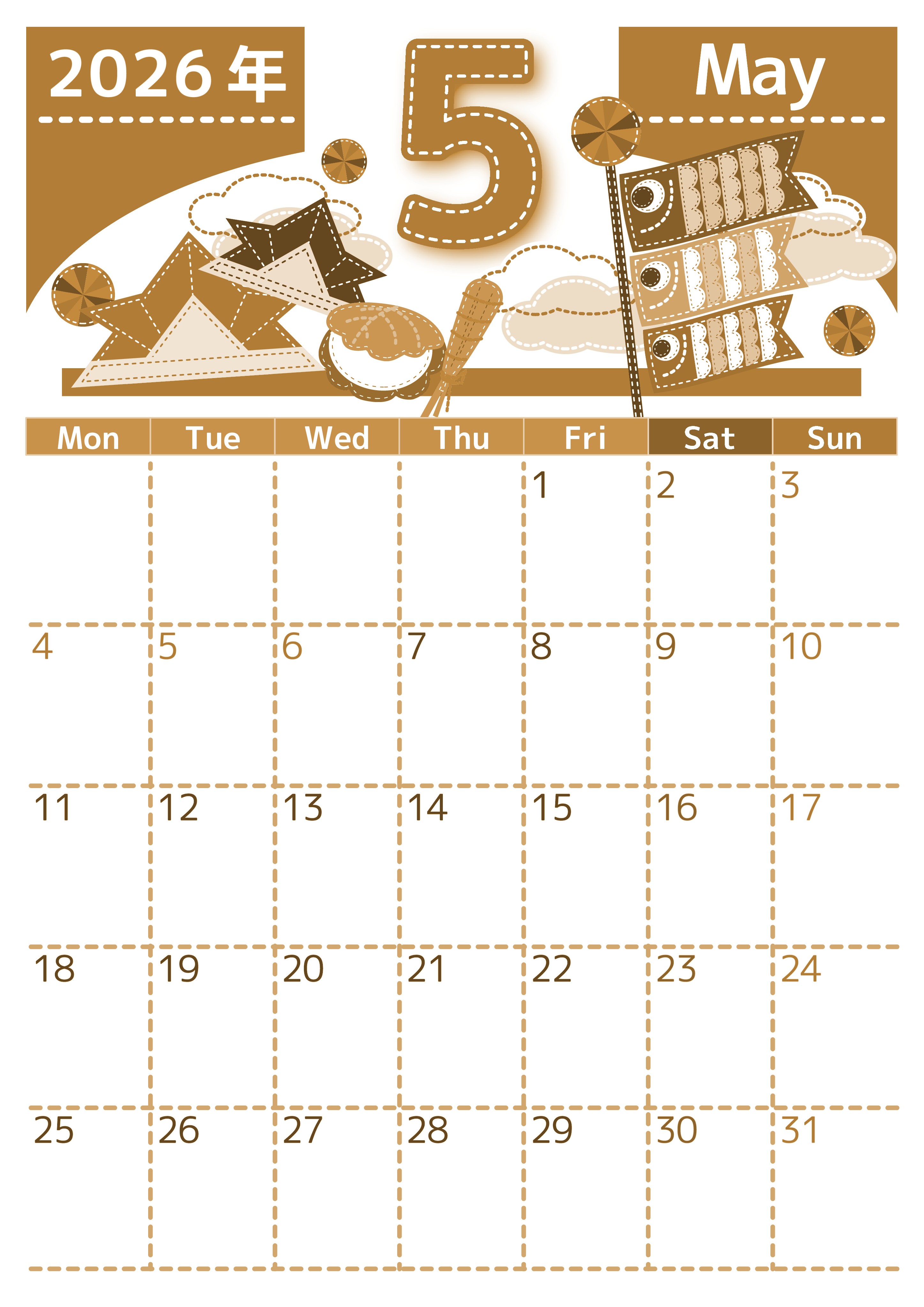 2026年5月縦型レトロな月曜始まりの無料テンプレートセピア調カレンダーです。セピア調カレンダー部分の罫線がグレーの点線で細部にまで工夫が凝らされている隅々までかわいい 鯉のぼりが主役のイラストのフリー素材となっています。(2026-00750511)