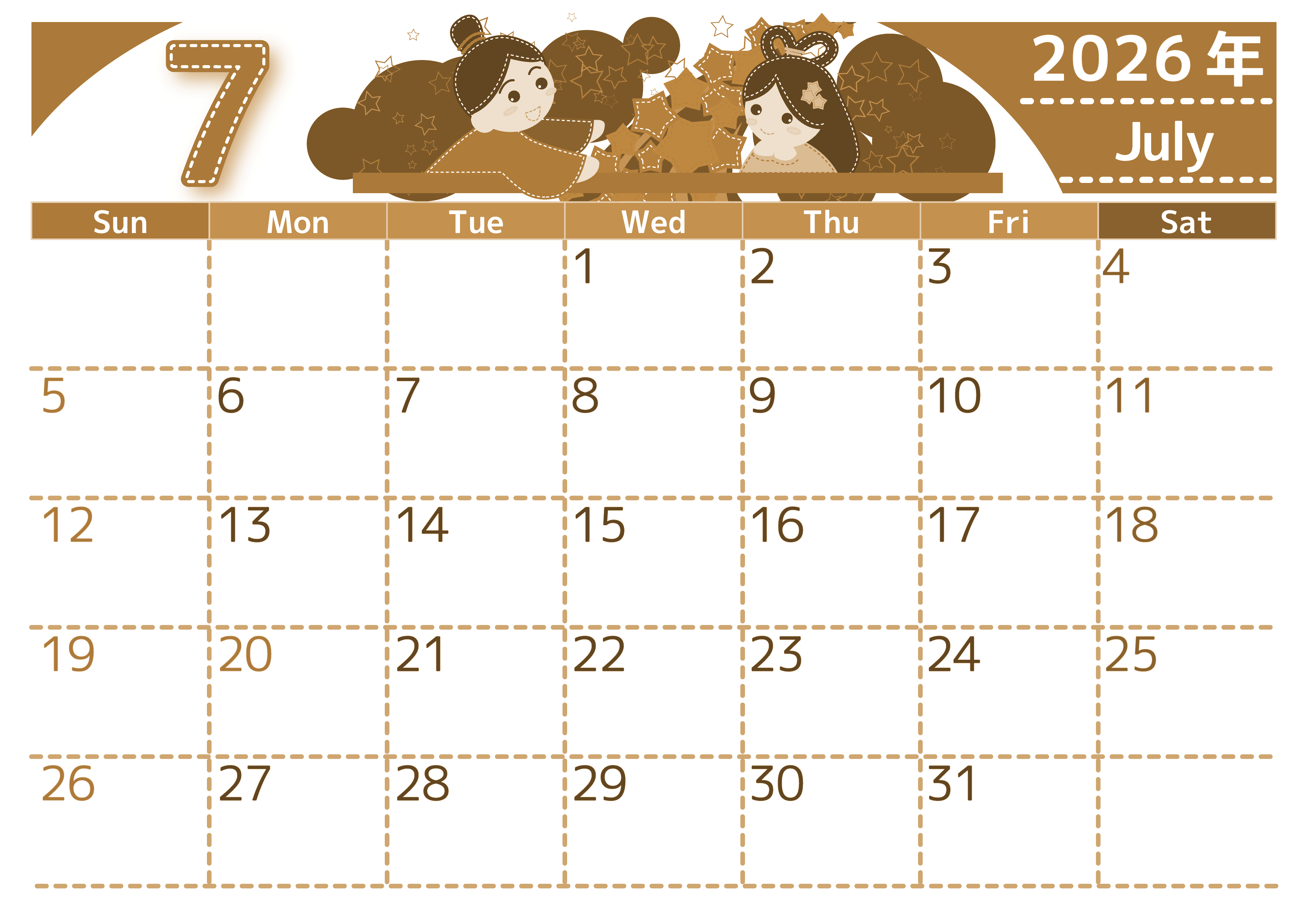 2026年7月横型レトロな日曜始まり 織姫と彦星イラストのかわいいA4無料セピア調カレンダー(2026-00750700)