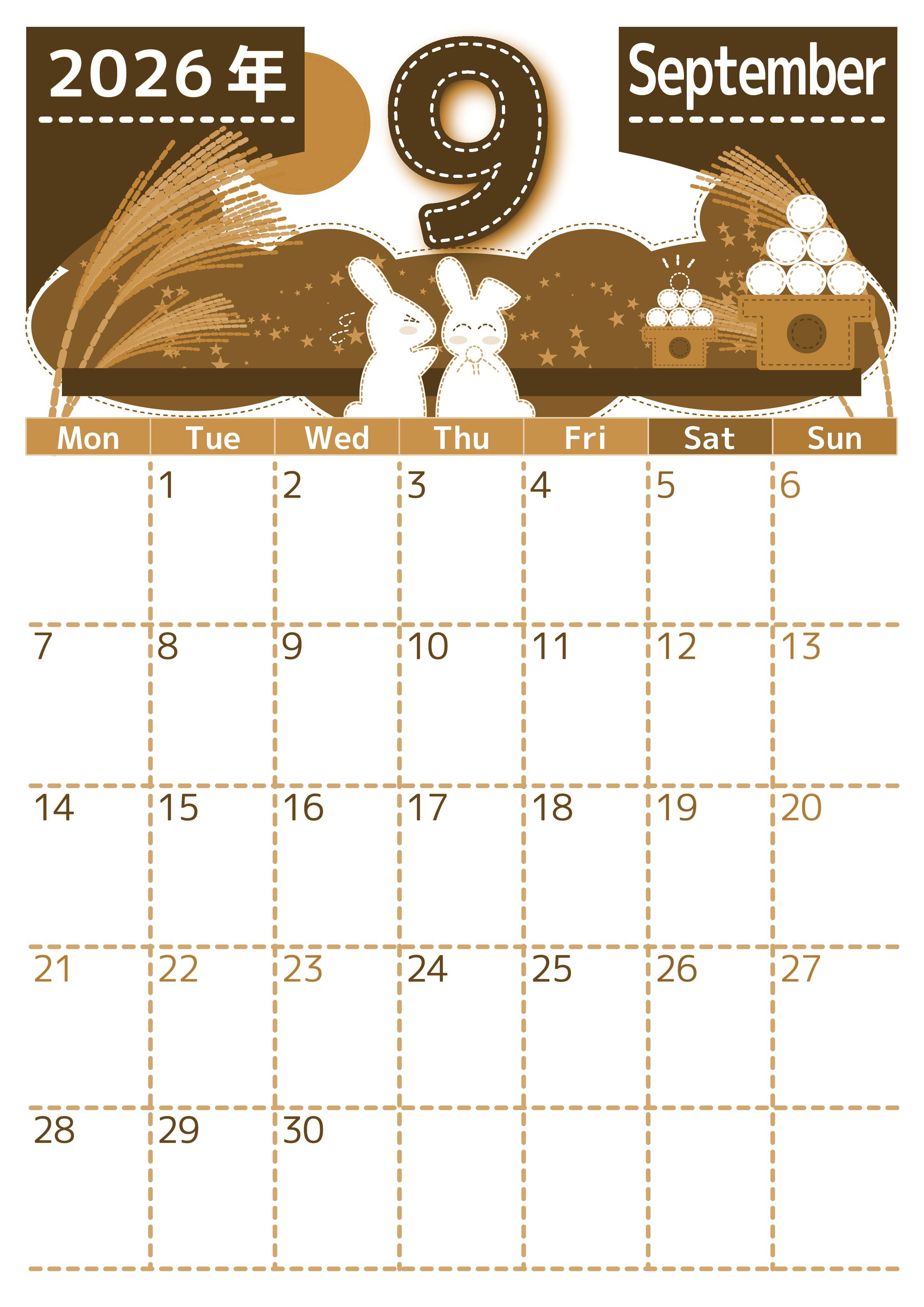 2026年・無料のカレンダーテンプレート 2026年9月縦型レトロな月曜始まり 白うさぎイラストのかわいいA4無料セピア調カレンダー(2026-00750911) 素材状デザイン王 2025年4月2日 2026年9月縦型レトロな月曜始まりの無料テンプレートセピア調カレンダーです。デザインは手芸チックで使うのが楽しくなるような月曜始まりの白うさぎかわいいイラストセピア調カレンダーを用意しました。(2026-00750911) 9月 縦型のカレンダー 月曜始まり セピア カレンダーデザイン-0075