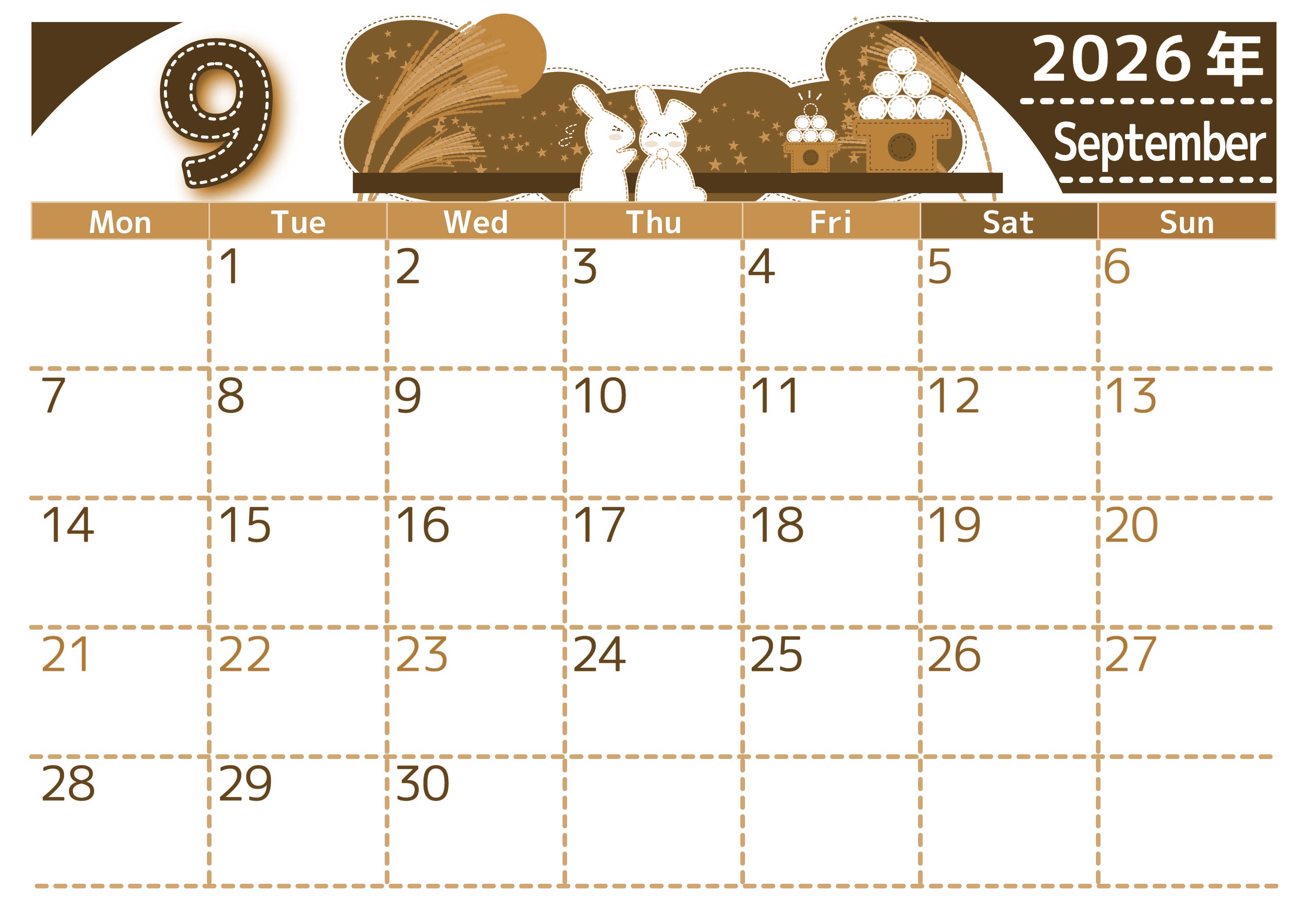 2026年9月横型レトロな月曜始まりの無料テンプレートセピア調カレンダーです。十五夜の厳かなシーンをポップに白うさぎをとりあげてかわいいテイストで描いているイラストが利用者の「使いたい!」という気持ちを盛り上げてくれます。(2026-00750901)