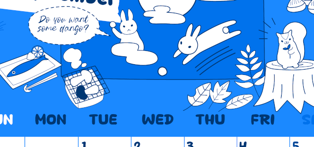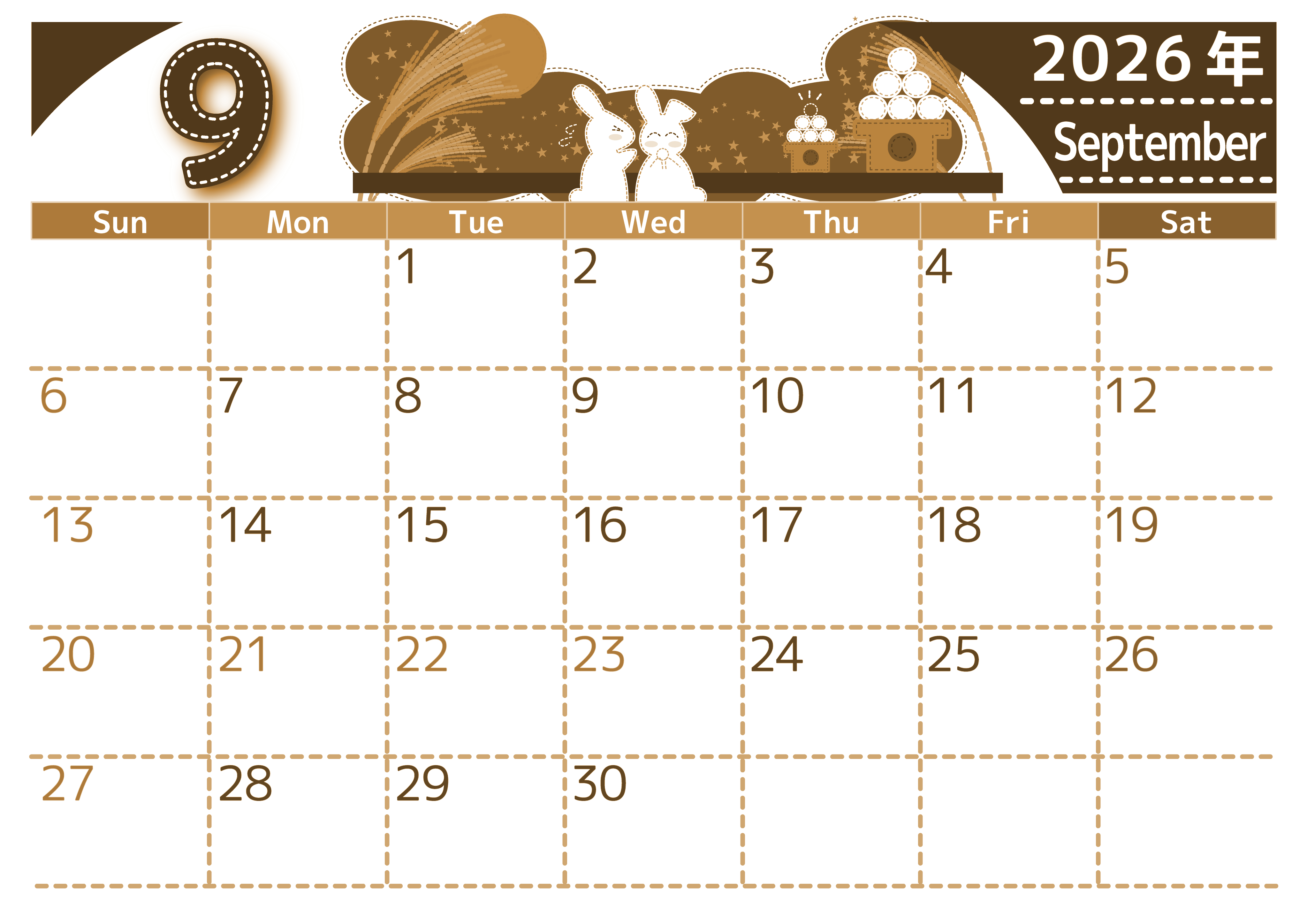 2026年9月横型レトロな日曜始まりの無料テンプレートセピア調カレンダーです。風にそよそよと吹かれてしなだれているススキと月見だんごと仲良くしている白うさぎのイラストがとてもかわいいイラストとなっています。(2026-00750900)