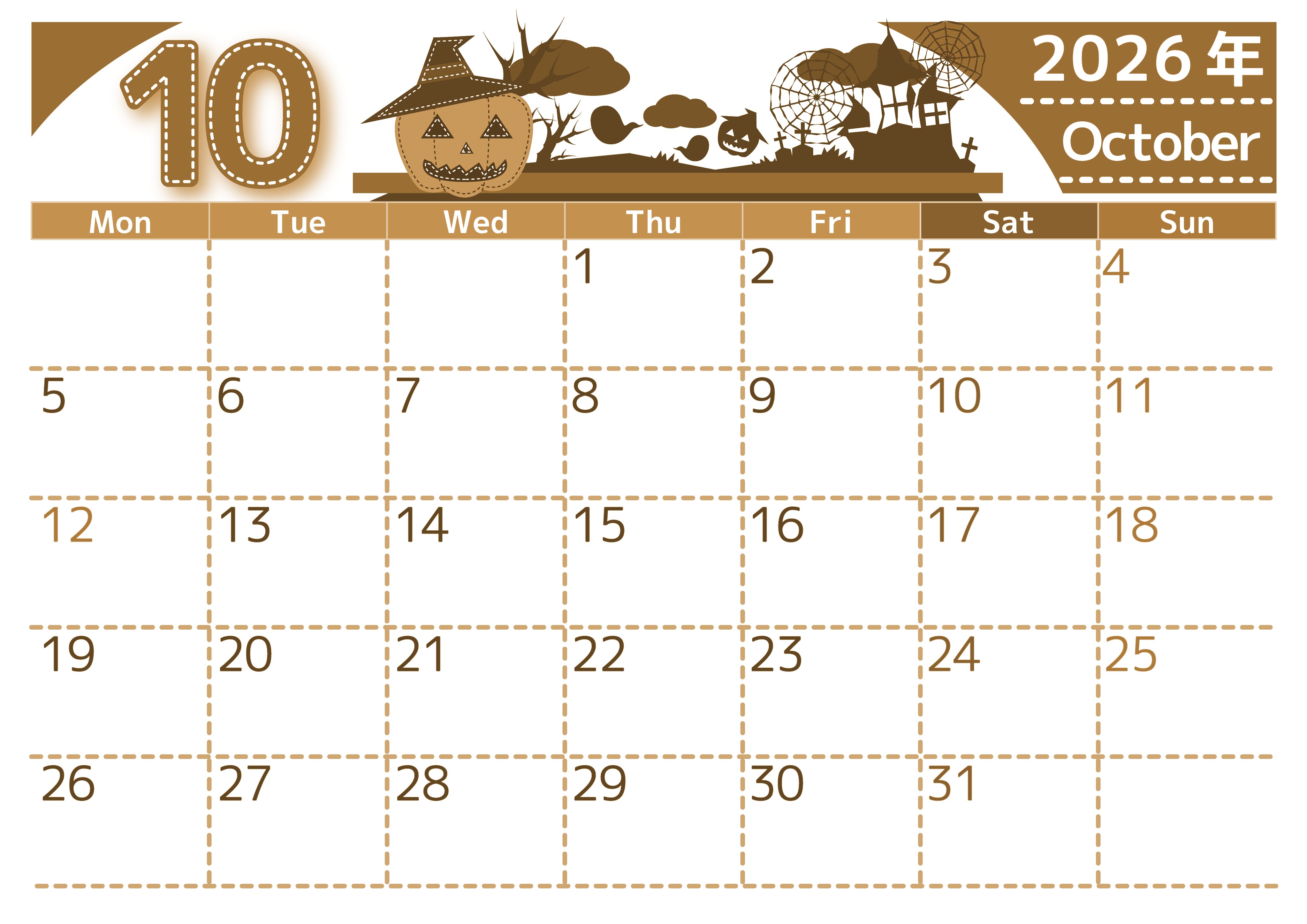 2026年10月横型レトロな月曜始まりの無料テンプレートセピア調カレンダーです。手芸テイストでハロウィンの怪しくもワクワクするような不思議な世界観をシルエットで表現しているかわいいイラストを添えた見やすいセピア調カレンダーとなっています。(2026-00751001)