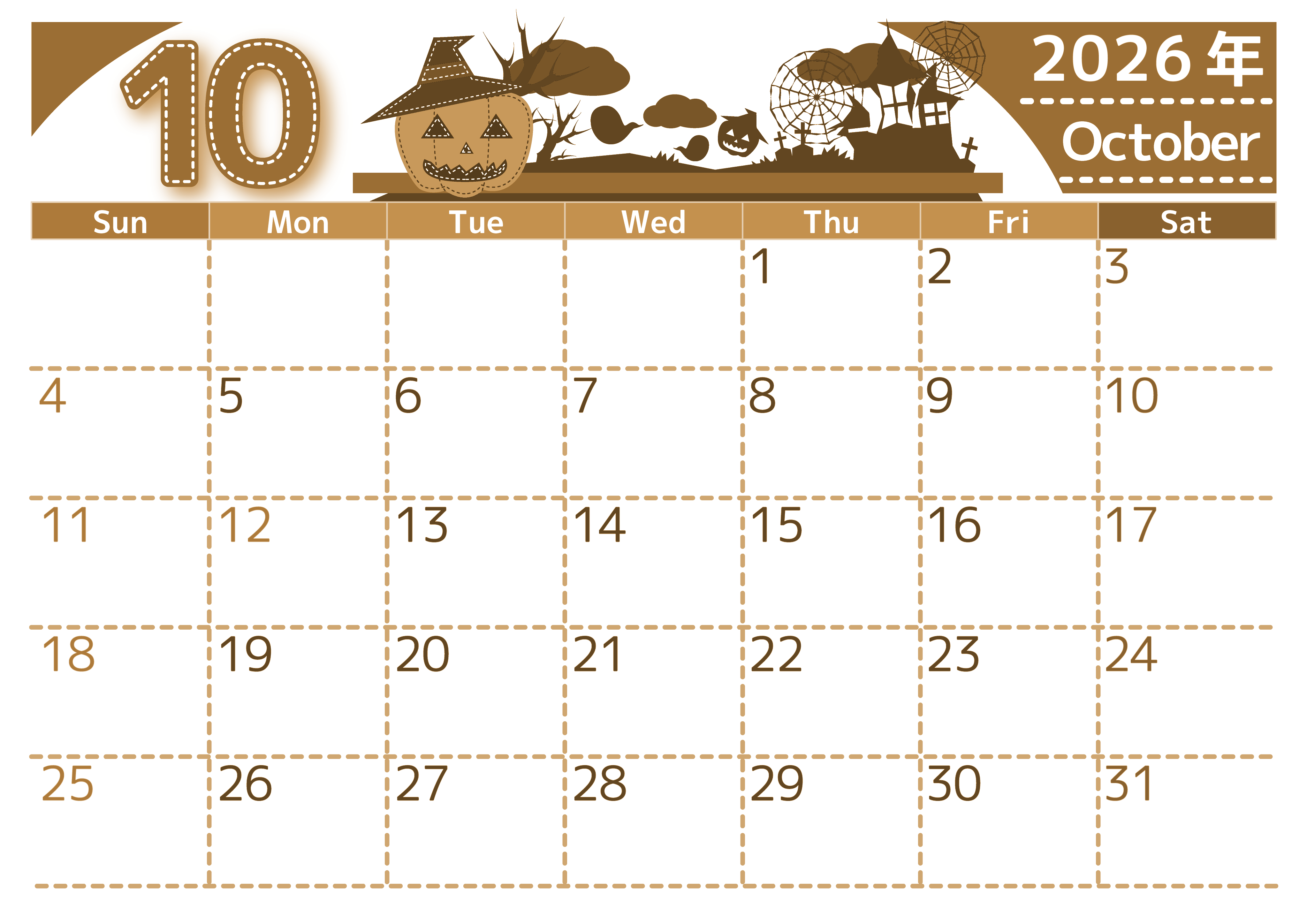 2026年10月横型レトロな日曜始まりの無料テンプレートセピア調カレンダーです。お化けやお屋敷をシルエットで描いてジャックオランタンのイラストが描かれている全体的にかわいいセピア調カレンダーとなっています。(2026-00751000)