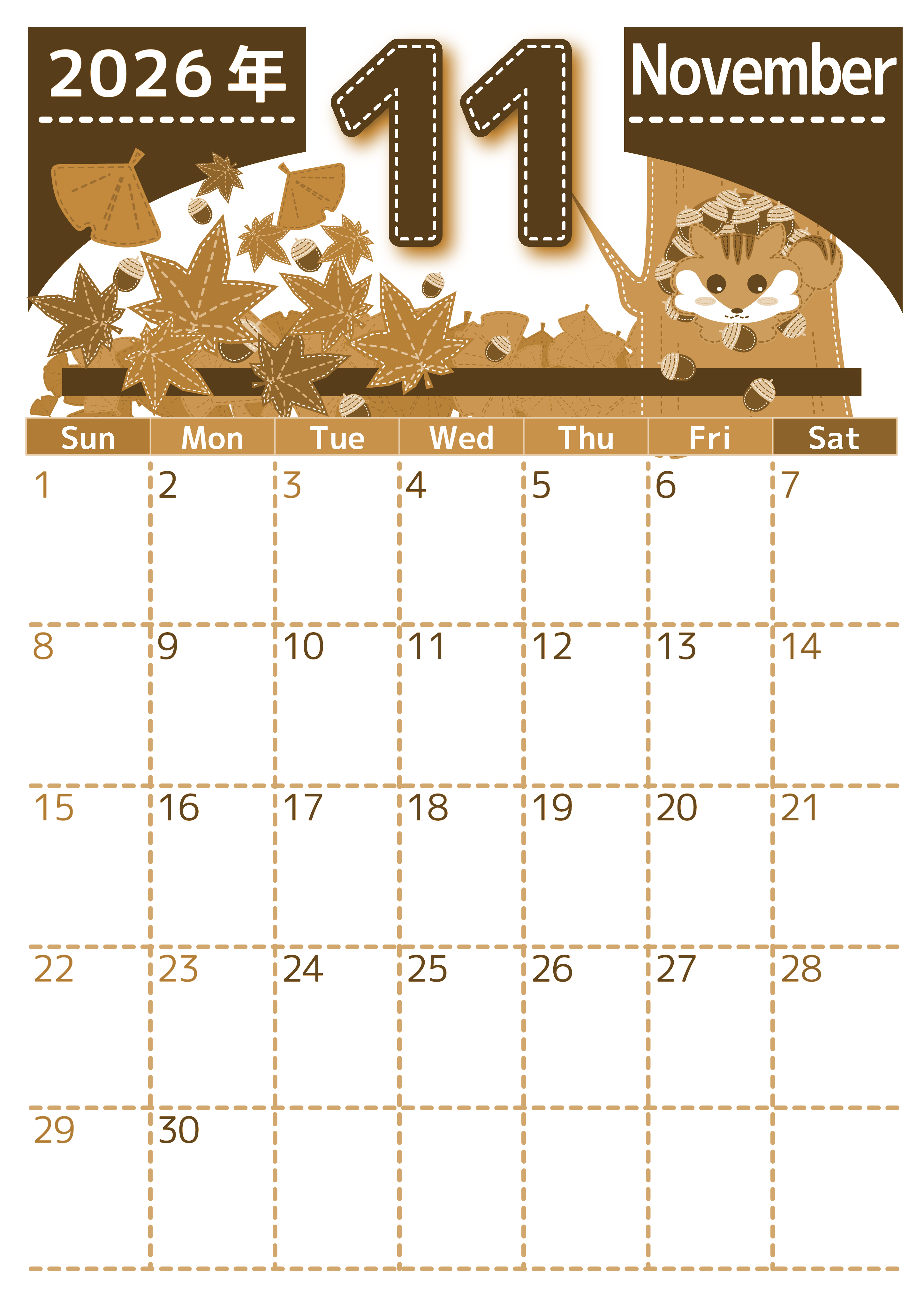 2026年11月縦型レトロな日曜始まりの無料テンプレートセピア調カレンダーです。リスと紅葉のコンビがかわいいイラスト素材です。曜日によって文字フォントの色合いが変更されているので見やすい実用的なデザインとなっています。(2026-00751110)