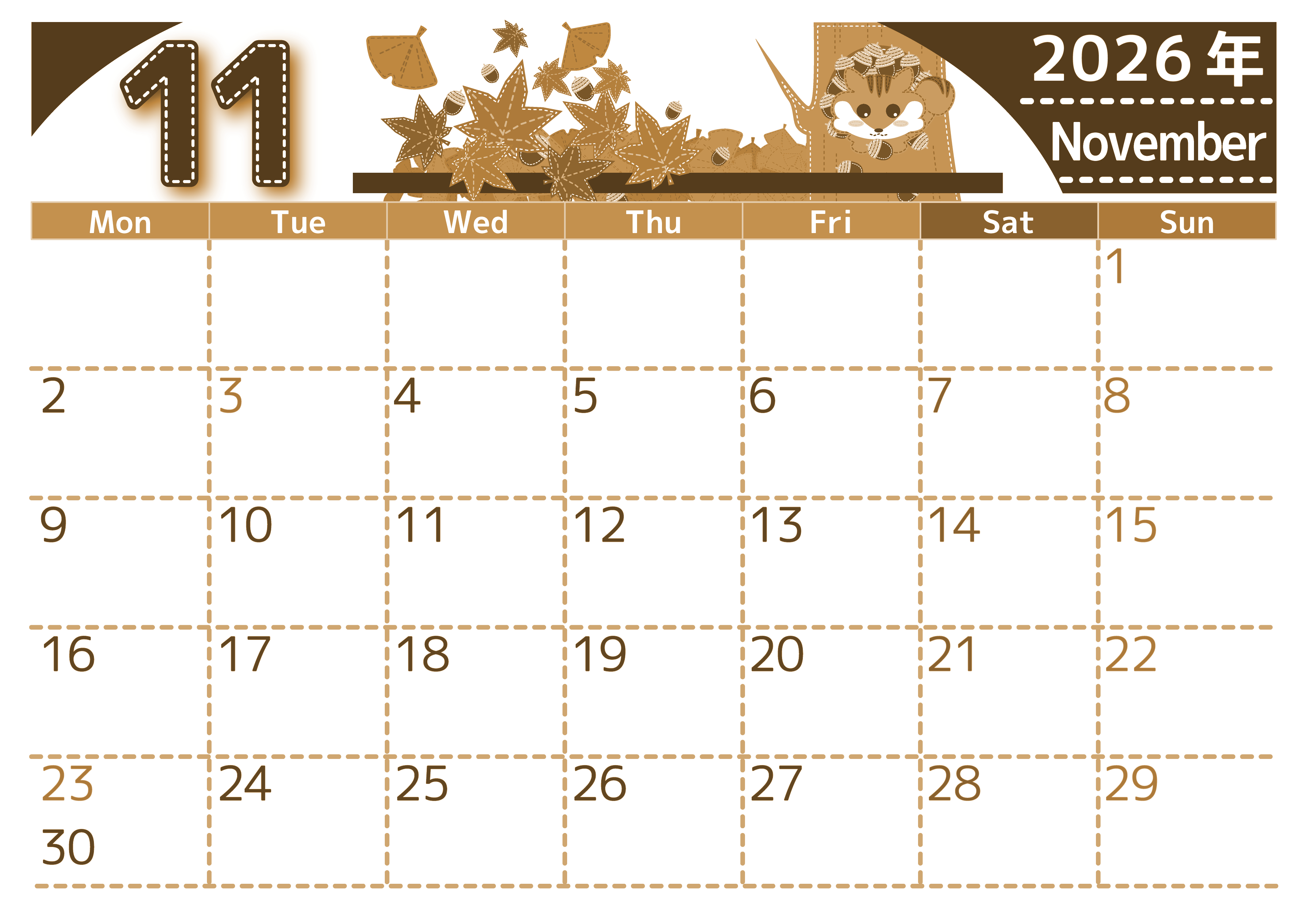 2026年11月横型レトロな月曜始まりの無料テンプレートセピア調カレンダーです。紅葉をハンドメイドテイストで表現したイラストがかわいいのでダウンロード利用をおすすめします。A4用紙に印刷するだけです。(2026-00751101)