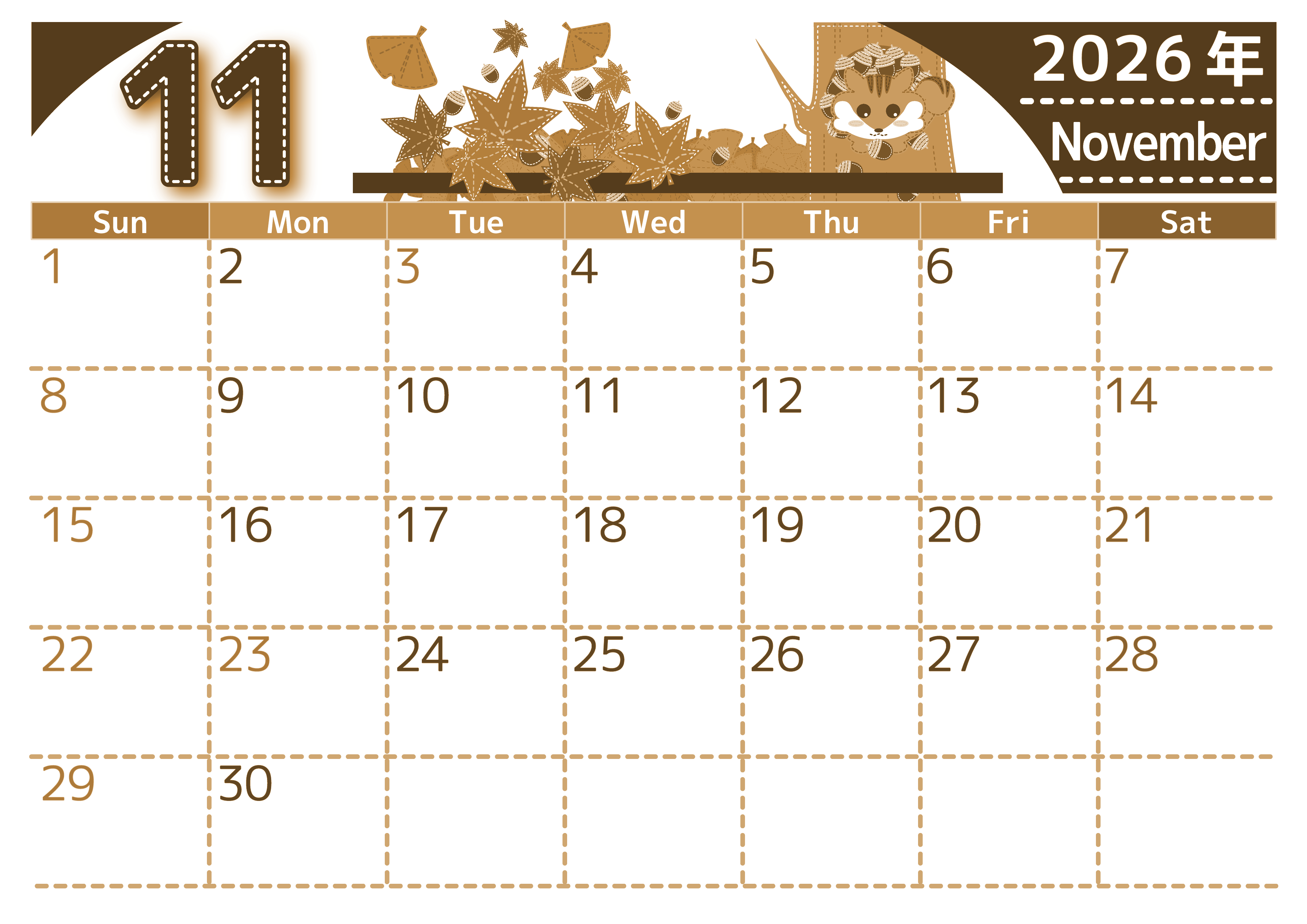2026年11月横型レトロな日曜始まり 紅葉イラストのかわいいA4無料セピア調カレンダー(2026-00751100)