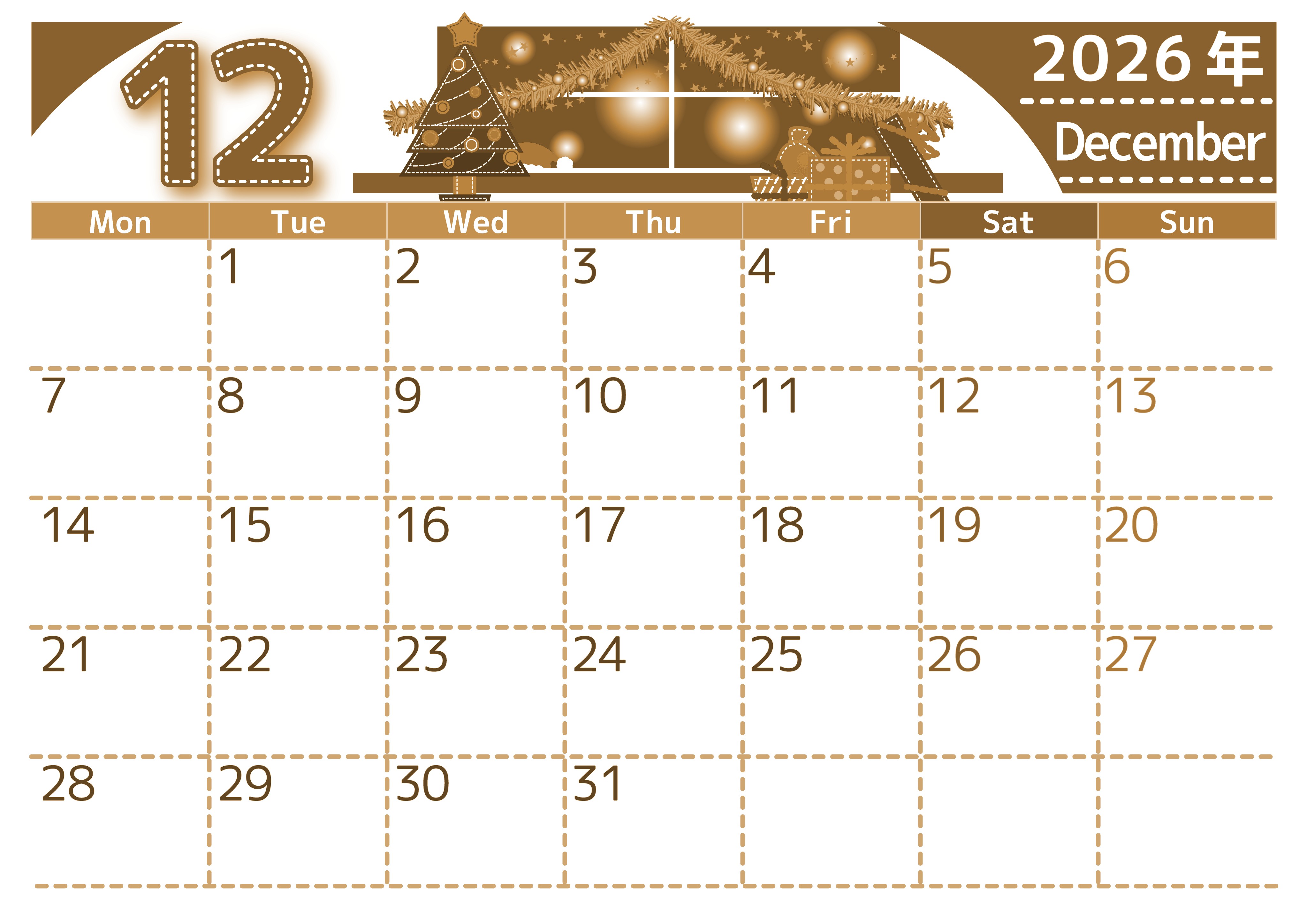 2026年・無料のカレンダーテンプレート 2026年12月横型レトロな月曜始まり クリスマスの夜イラストのかわいいA4無料セピア調カレンダー(2026-00751201) 素材状デザイン王 2025年4月2日 2026年12月横型レトロな月曜始まりの無料テンプレートセピア調カレンダーです。クリスマスの夜の室内の様子を描いているかわいいハンドメイドテイストのイラストセピア調カレンダーです。(2026-00751201) 12月 横型のカレンダー 月曜始まり セピア カレンダーデザイン-0075