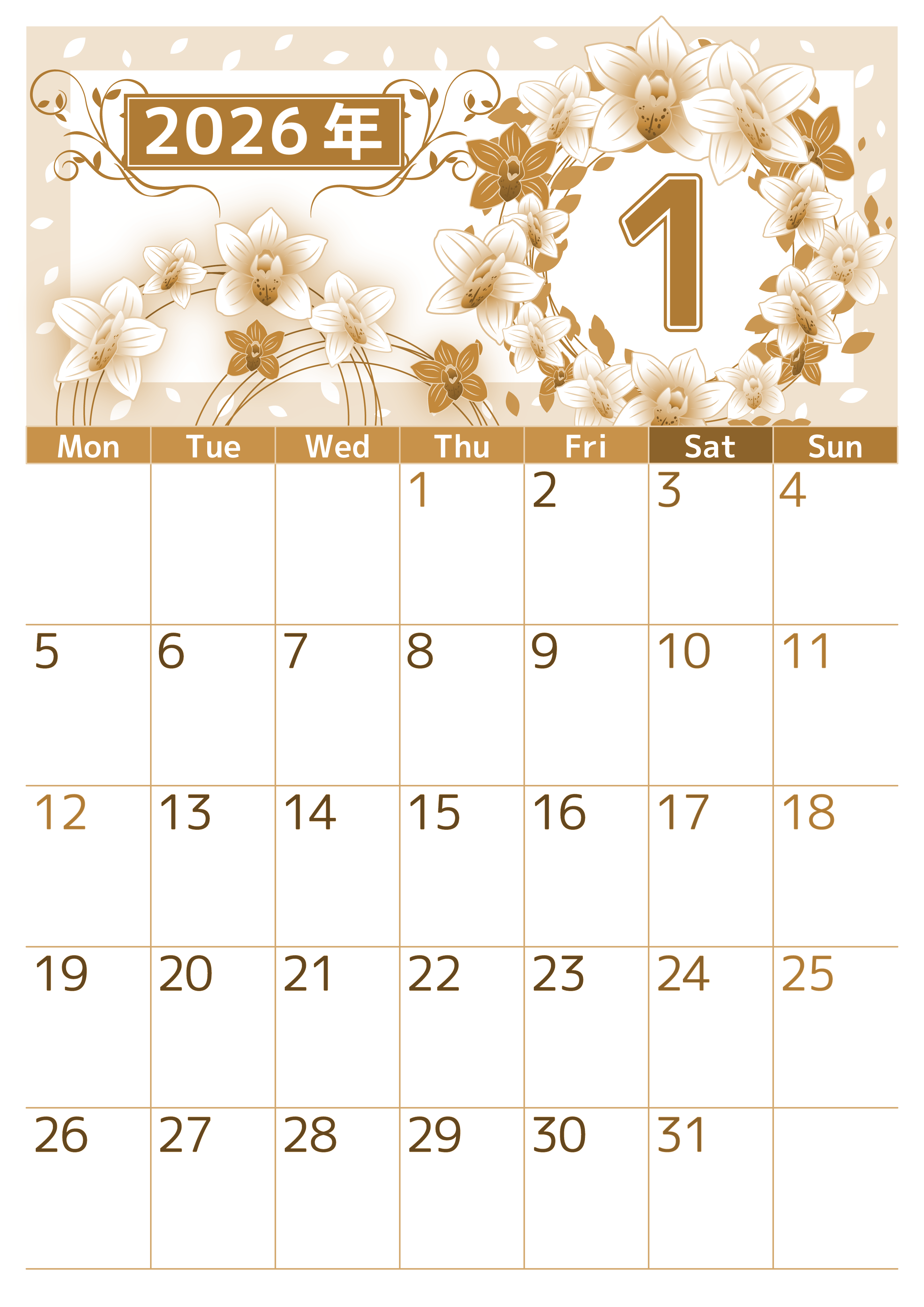 2026年・無料のカレンダーテンプレート 2026年1月縦型レトロな月曜始まり イラストのおしゃれA4無料セピア調カレンダー(2026-00760111) 素材状デザイン王 2025年4月2日 2026年1月縦型レトロな月曜始まりの無料テンプレートセピア調カレンダーです。元旦を迎えて忙しい時期のやることを整理するのに適切なおしゃれカレンダーとなっています。(2026-00760111) 1月 縦型のカレンダー 月曜始まり セピア カレンダーデザイン-0076