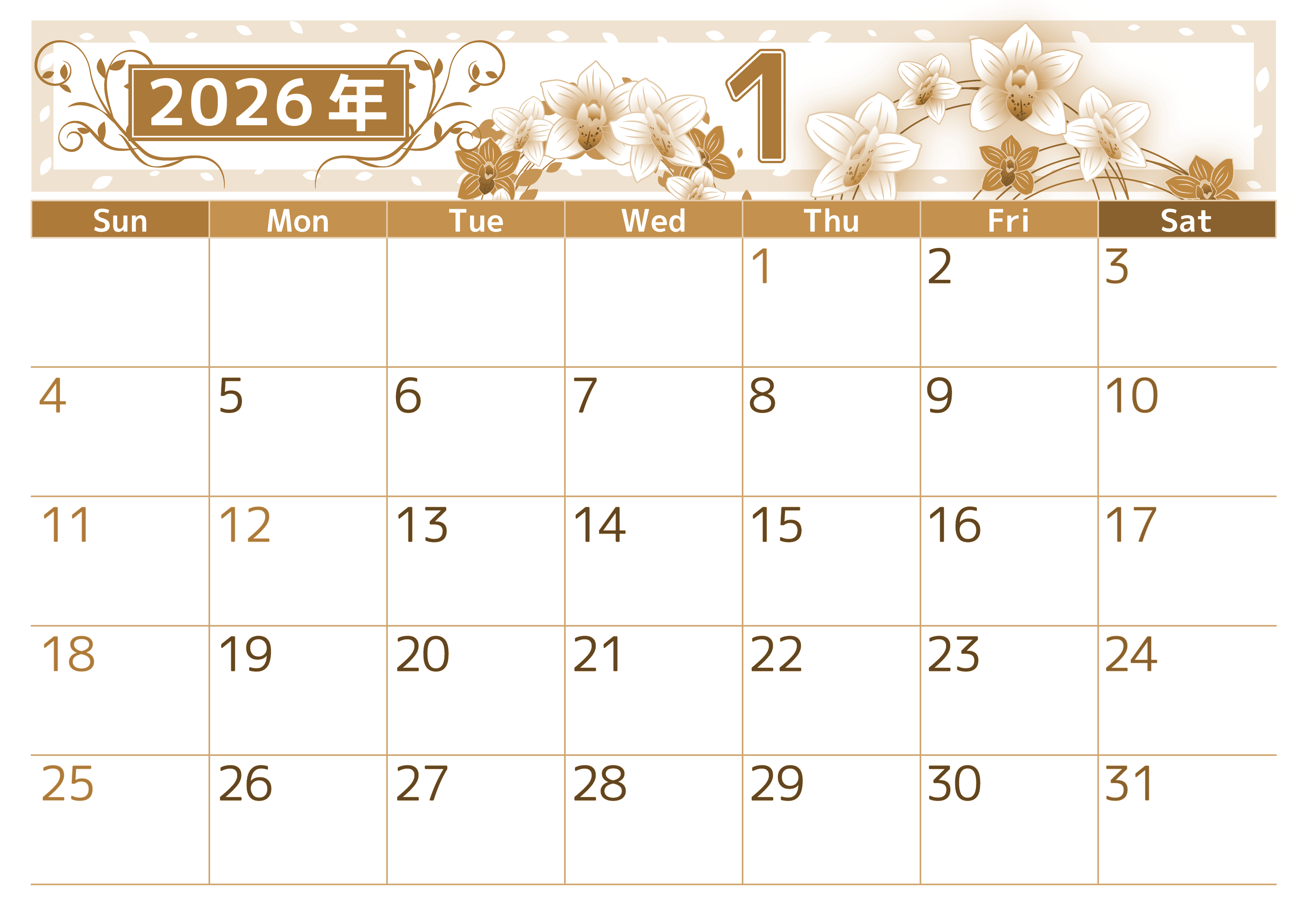 2026年1月横型レトロな日曜始まりの無料テンプレートセピア調カレンダーです。華やかな大きな花々が優雅な気持ちにさせてくれるようなおしゃれイラストです。寒さにやられてしんどい時期でもありますが前向きにさせてくれるような気がしますね。(2026-00760100)