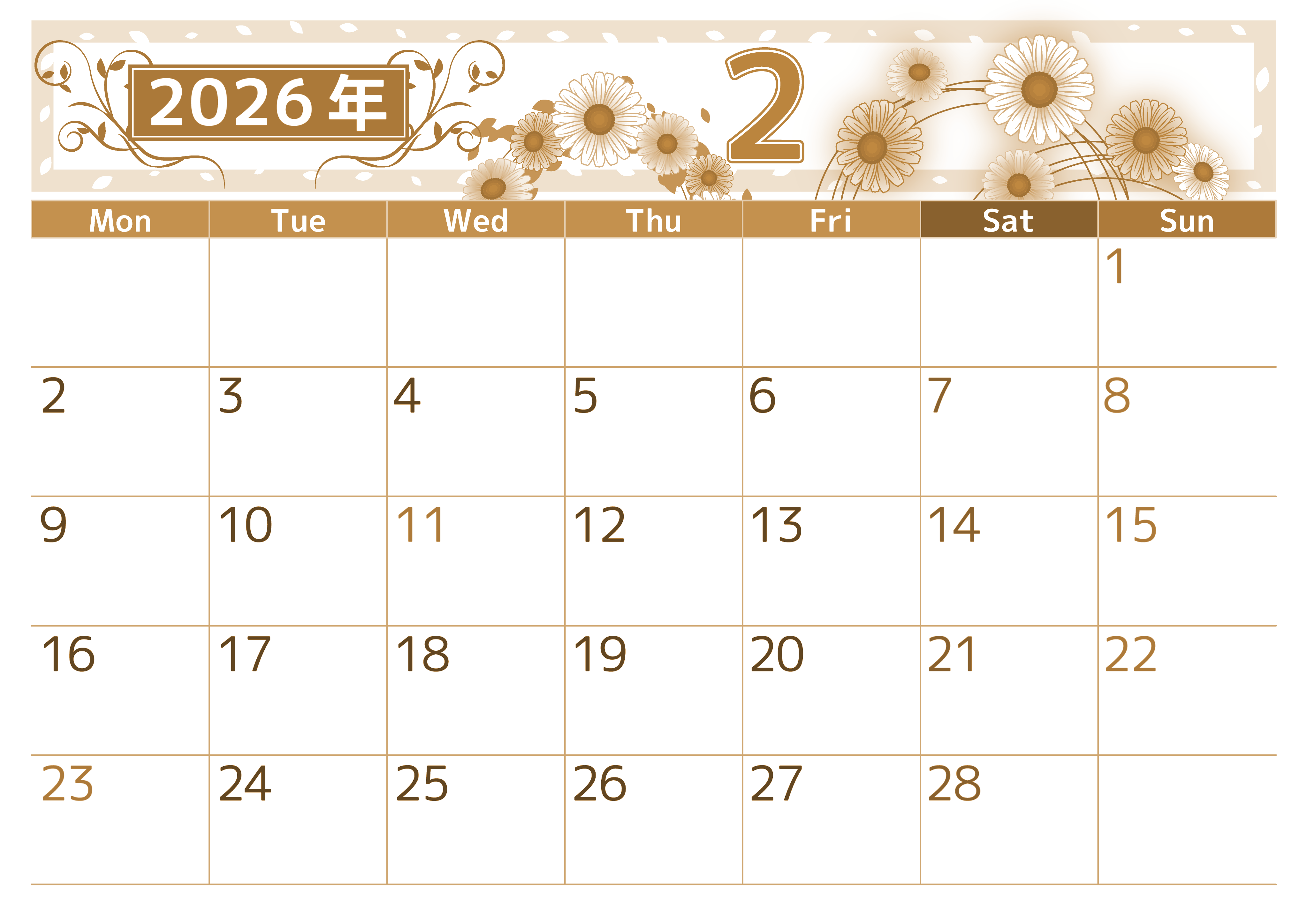 2026年・無料のカレンダーテンプレート 2026年2月横型レトロな月曜始まり イラストのおしゃれA4無料セピア調カレンダー(2026-00760201) 素材状デザイン王 2025年4月2日 2026年2月横型レトロな月曜始まりの無料テンプレートセピア調カレンダーです。真冬の寒くてセンチメンタルな気持ちを吹き飛ばしてくれるようなおしゃれイラストデザインです。(2026-00760201) 2月 横型のカレンダー 月曜始まり セピア カレンダーデザイン-0076