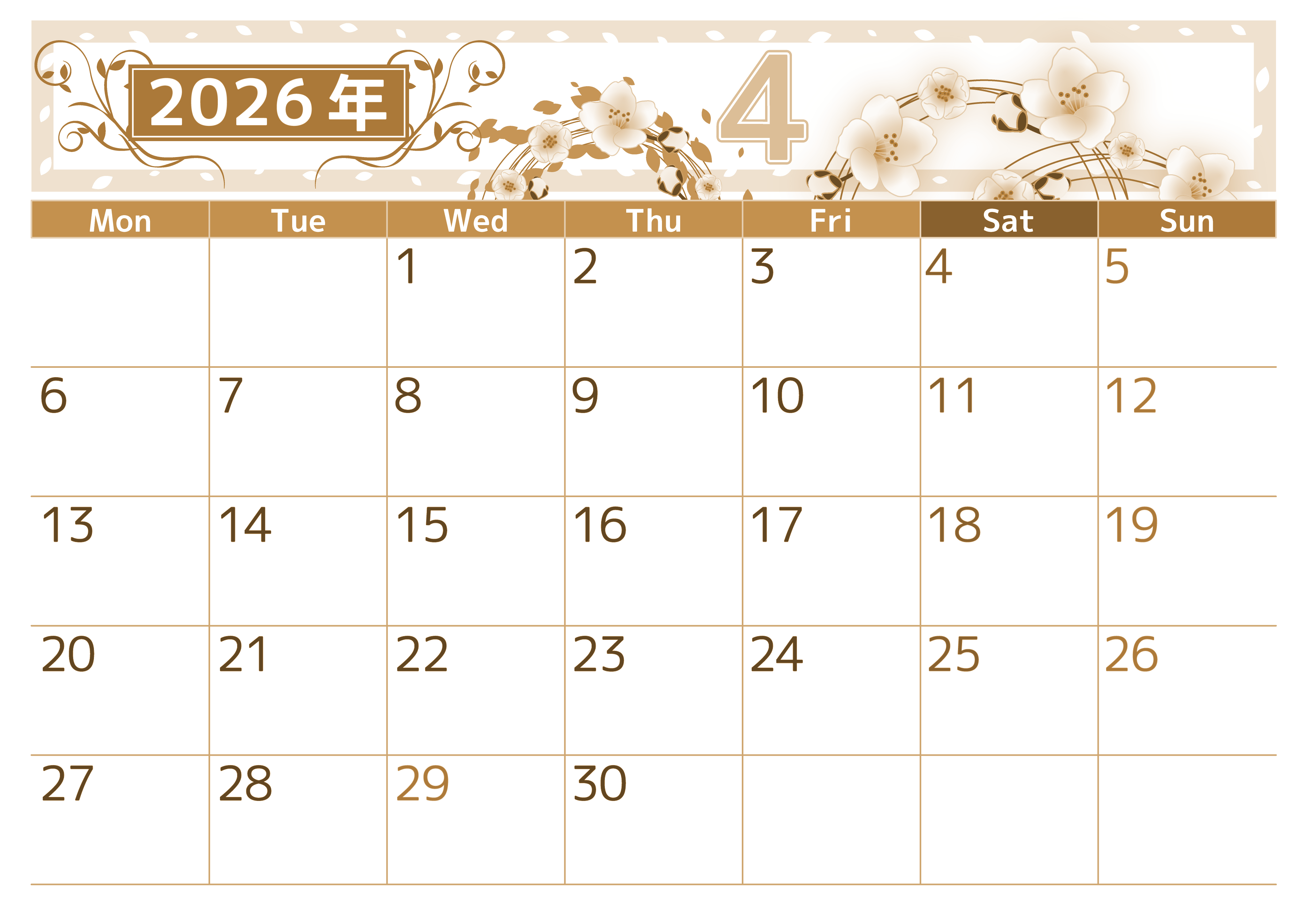 2026年4月横型レトロな月曜始まりの無料テンプレートセピア調カレンダーです。春の儚さを思わせる桜の一種であるソメイヨシノのイラストがおしゃれなセピア調カレンダーです。文字フォントは丸ゴシックなのでとても見やすいです。(2026-00760401)