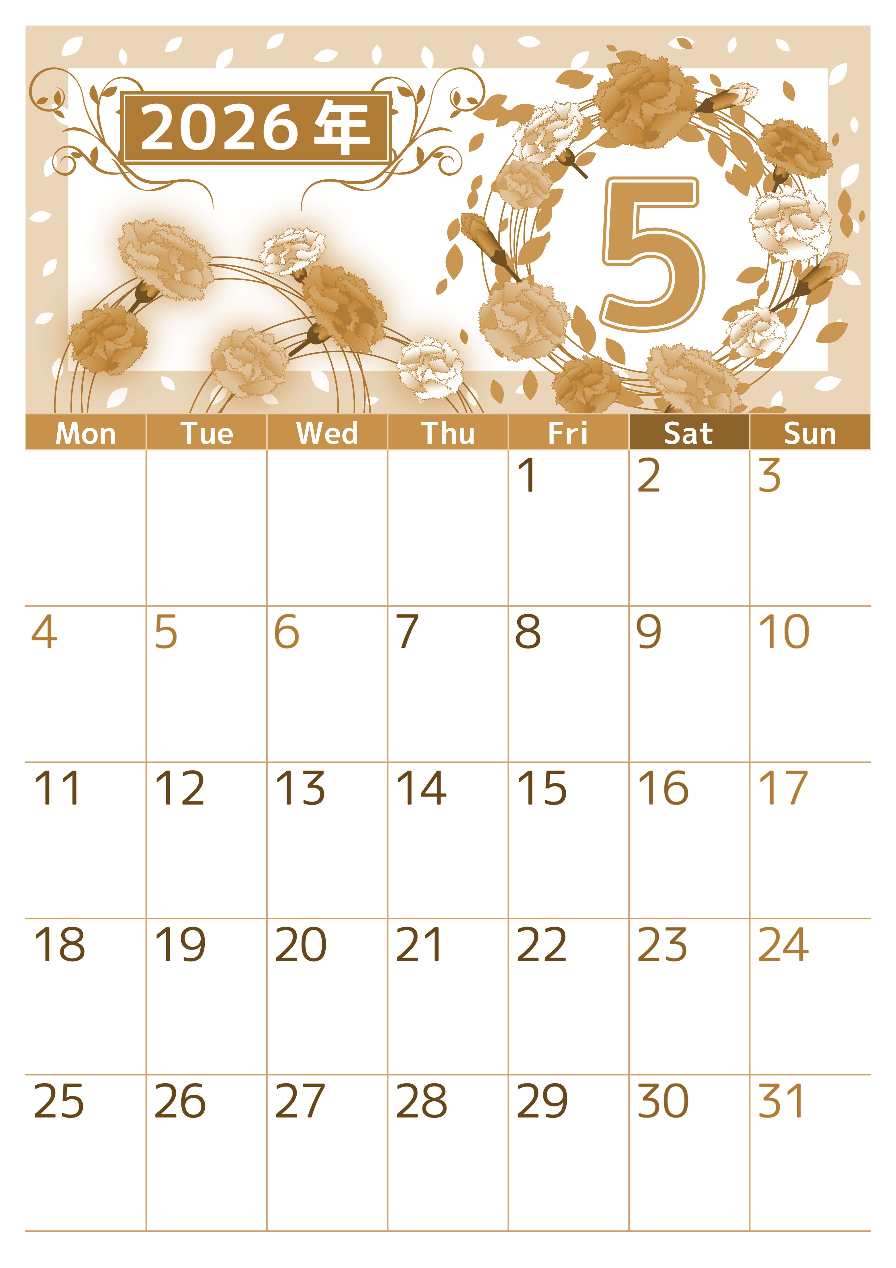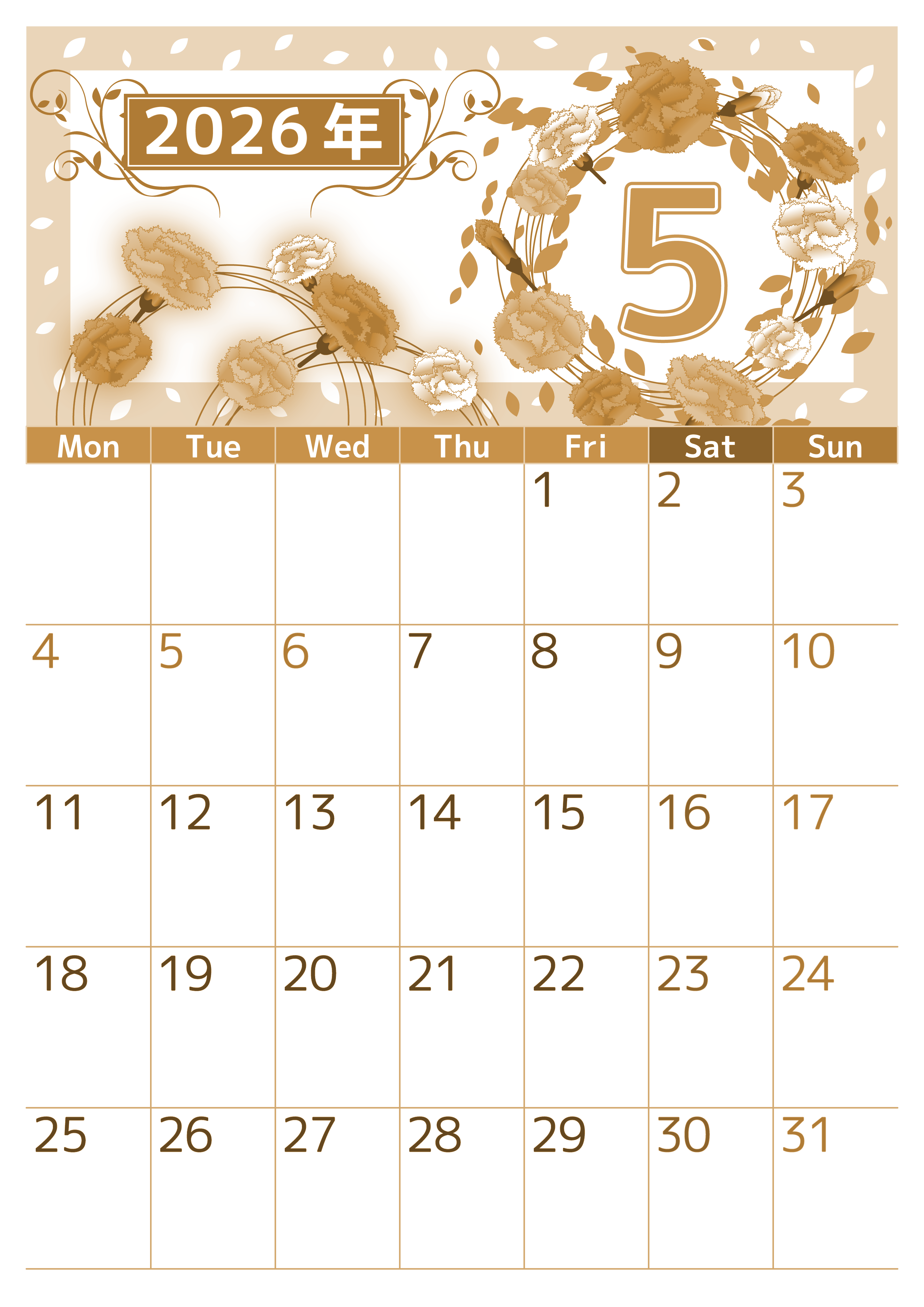 2026年5月縦型レトロな月曜始まりの無料テンプレートセピア調カレンダーです。スケジュールを立てやすいレイアウトなだけでなく5月のカーネーションのイラストがおしゃれで魅力的なデザインの素材となっているのでおすすめです。(2026-00760511)