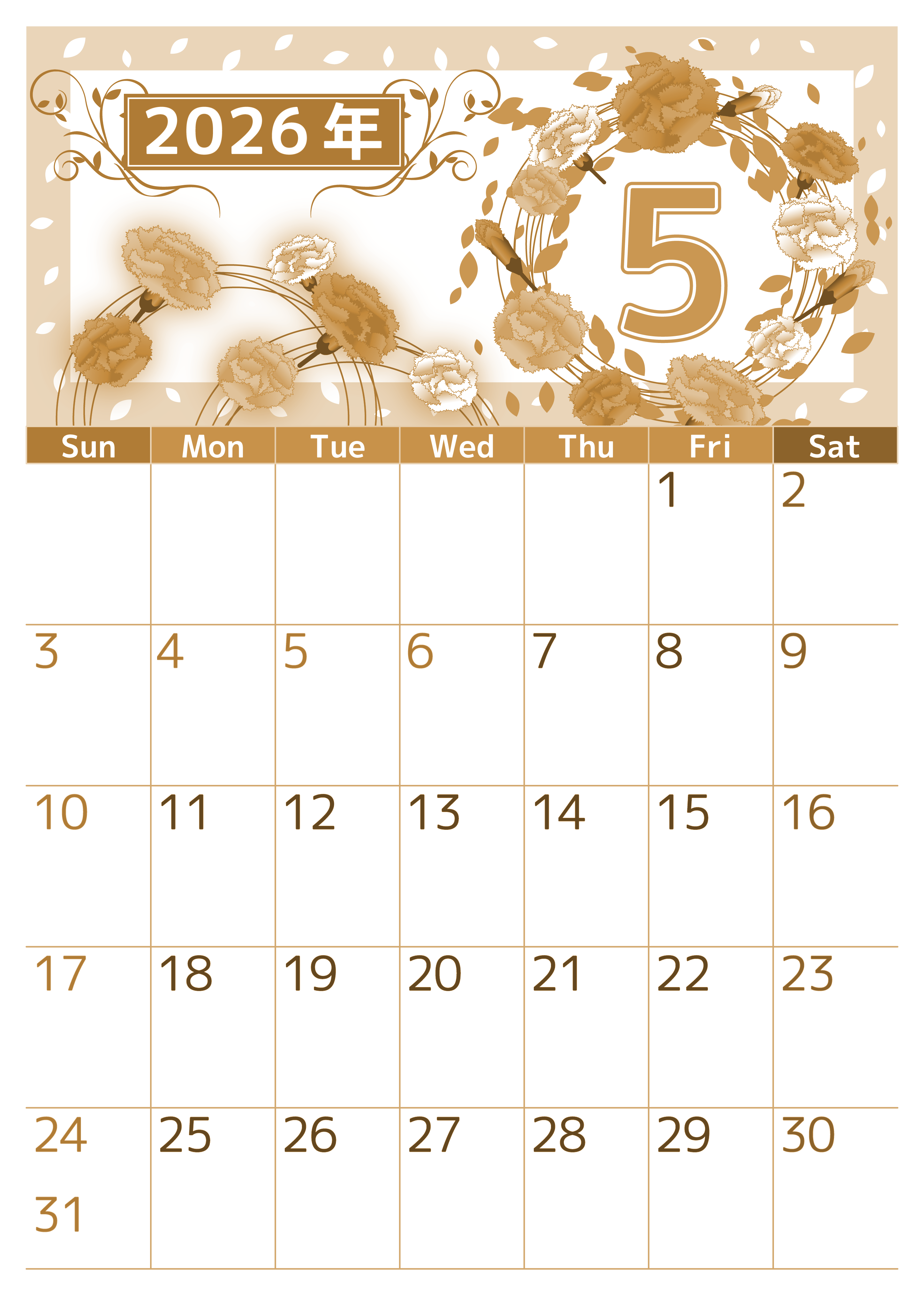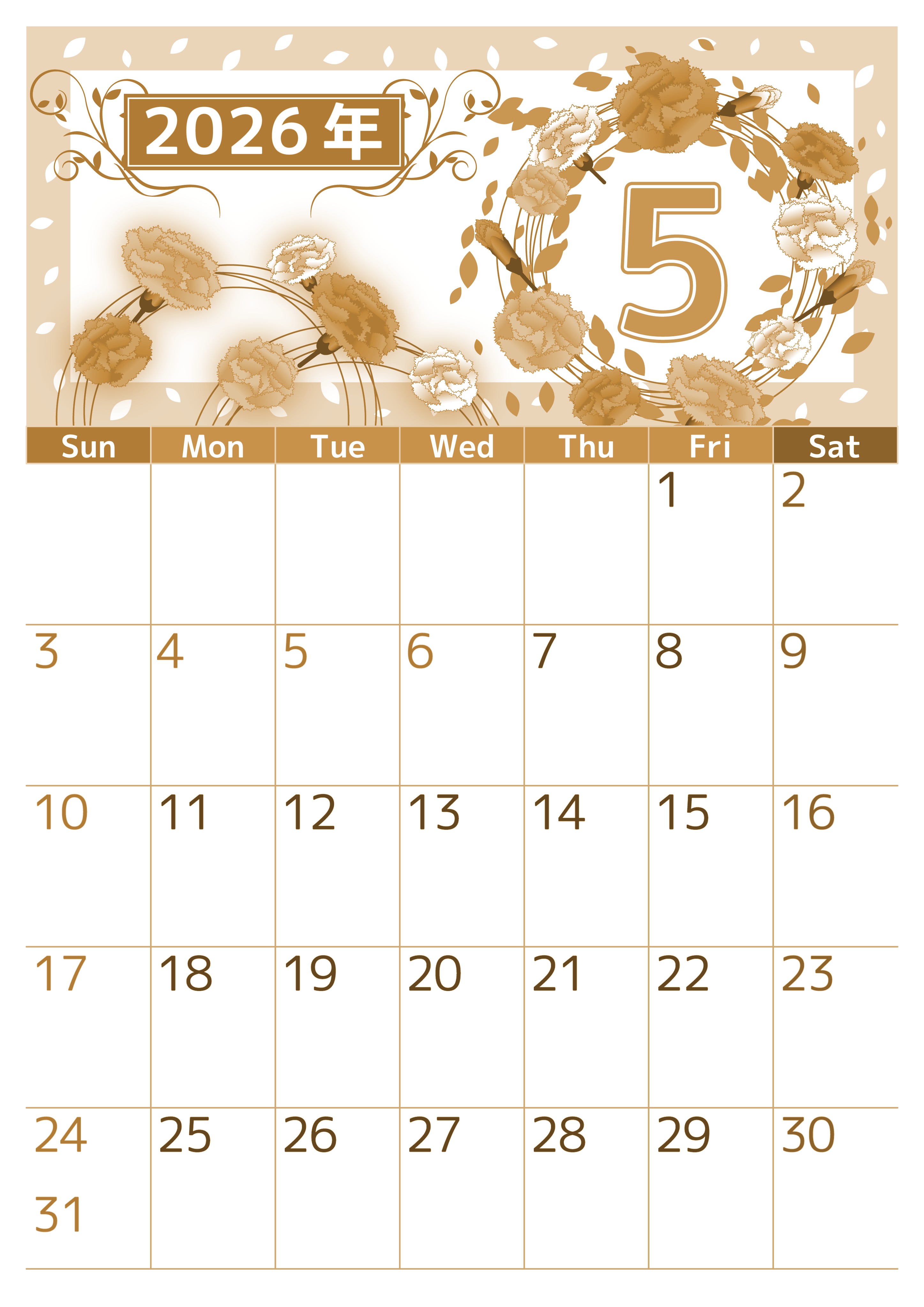 2026年5月縦型レトロな日曜始まりの無料テンプレートセピア調カレンダーです。母の日をテーマにしたおしゃれで大人っぽいカーネーションのイラストとなっています。縦向きなので壁に貼って使うのに向いているフリー素材です。(2026-00760510)