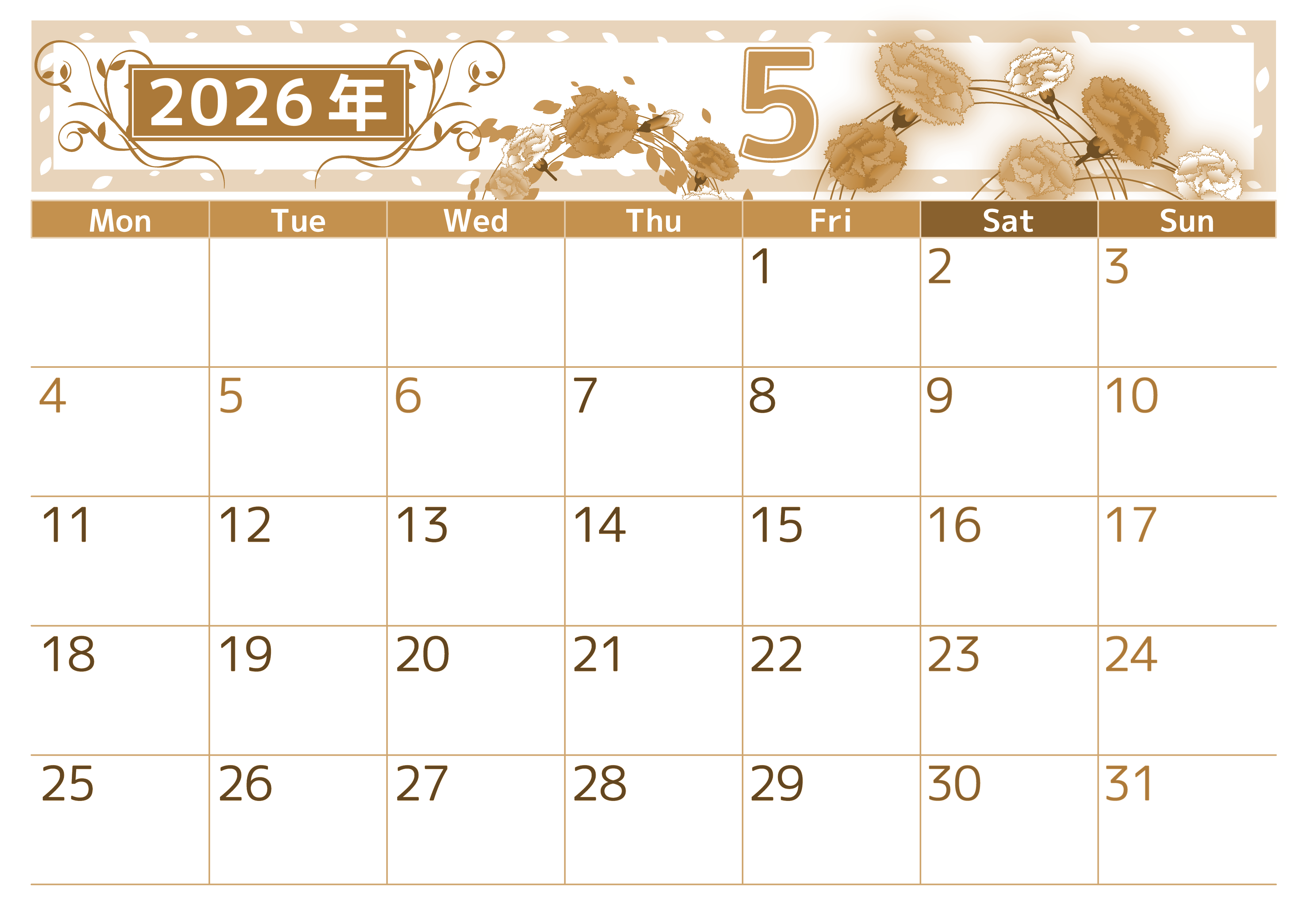 2026年5月横型レトロな月曜始まりの無料テンプレートセピア調カレンダーです。イラスト部分はカーネーションがおしゃれに咲き誇っていながらもセピア調カレンダー部分は余白を十分に確保しているので予定を書き込みやすいです。(2026-00760501)