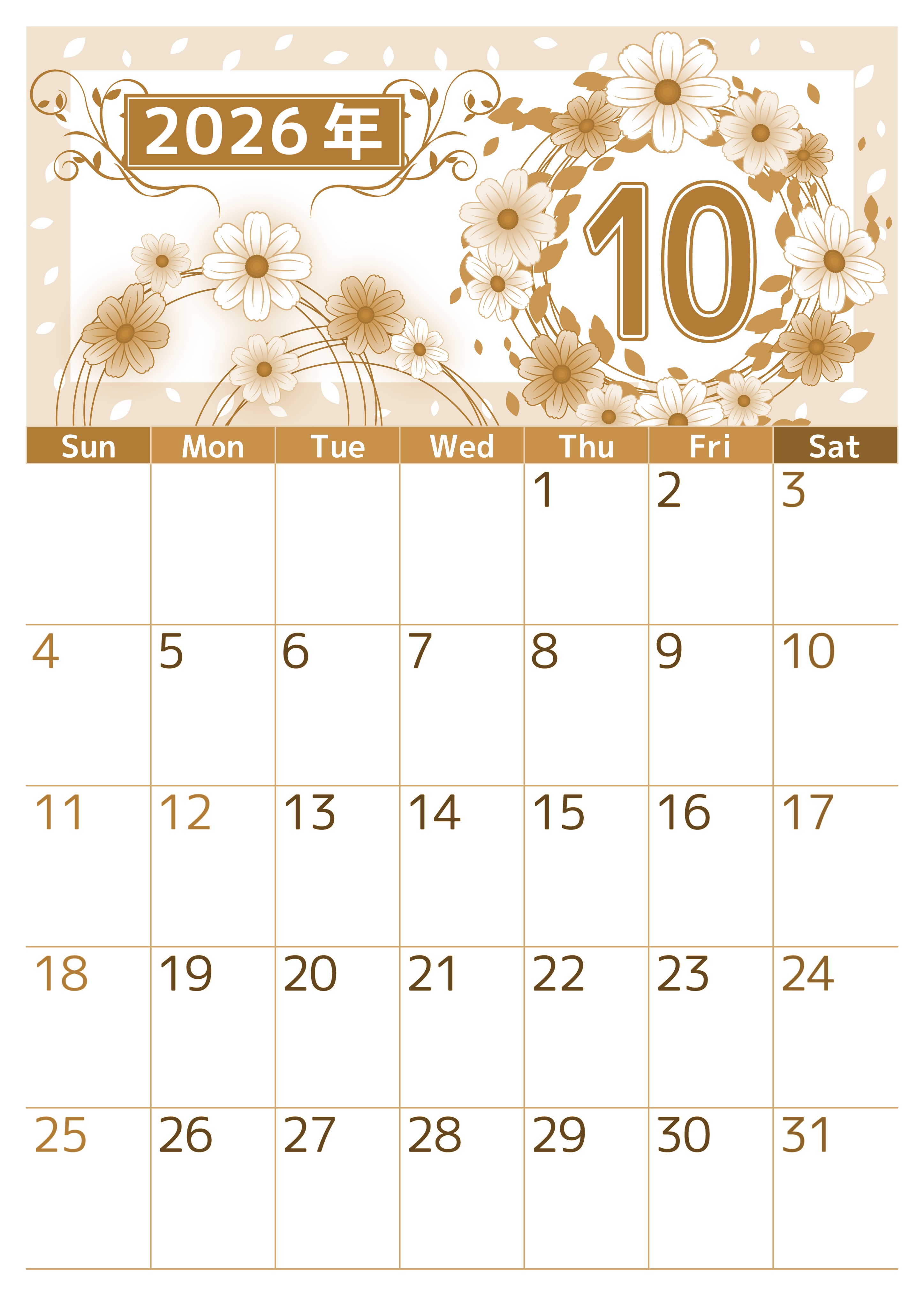2026年10月縦型レトロな日曜始まりの無料テンプレートセピア調カレンダーです。秋の道端に咲いているのを見つけると嬉しくなる花の代表であるコスモスを取り上げたイラストがとてもおしゃれなデザインのセピア調カレンダーです。(2026-00761010)
