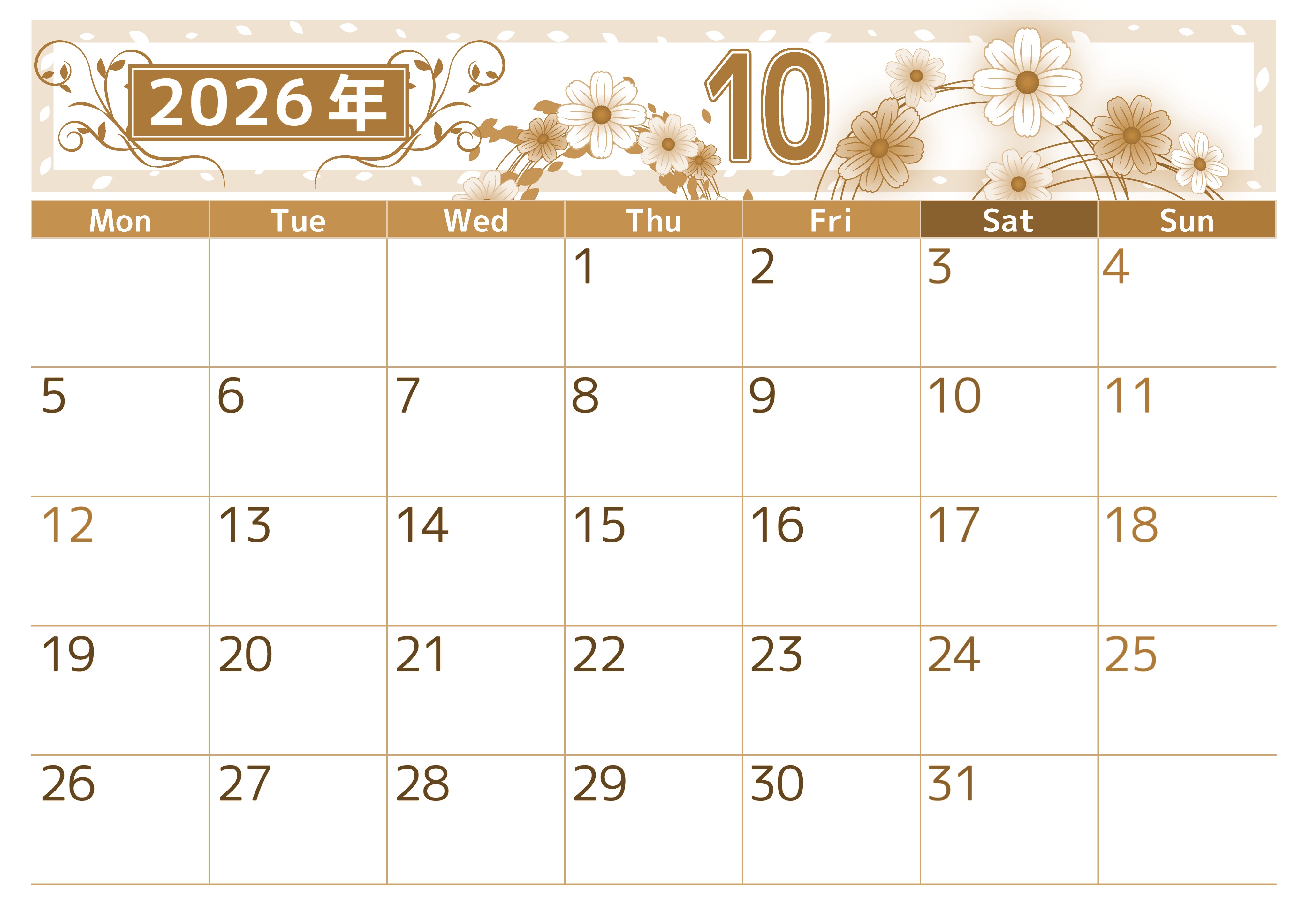 2026年10月横型レトロな月曜始まりの無料テンプレートセピア調カレンダーです。コスモスのコンビネーションがおしゃれで落ち着いた気持ちにさせてくれる快適に使えて目にも優しいイラストセピア調カレンダーとなっています。(2026-00761001)