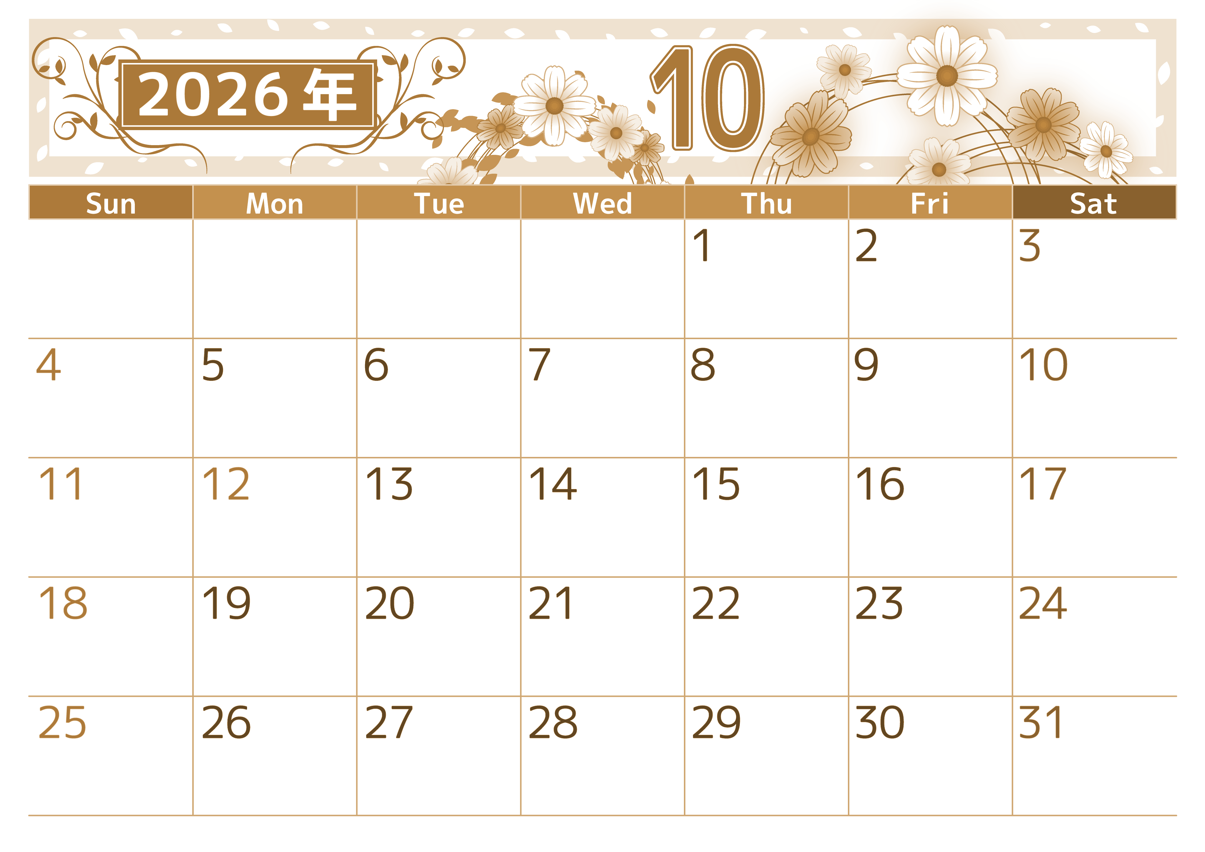 2026年10月横型レトロな日曜始まり コスモスイラストのおしゃれA4無料セピア調カレンダー(2026-00761000)