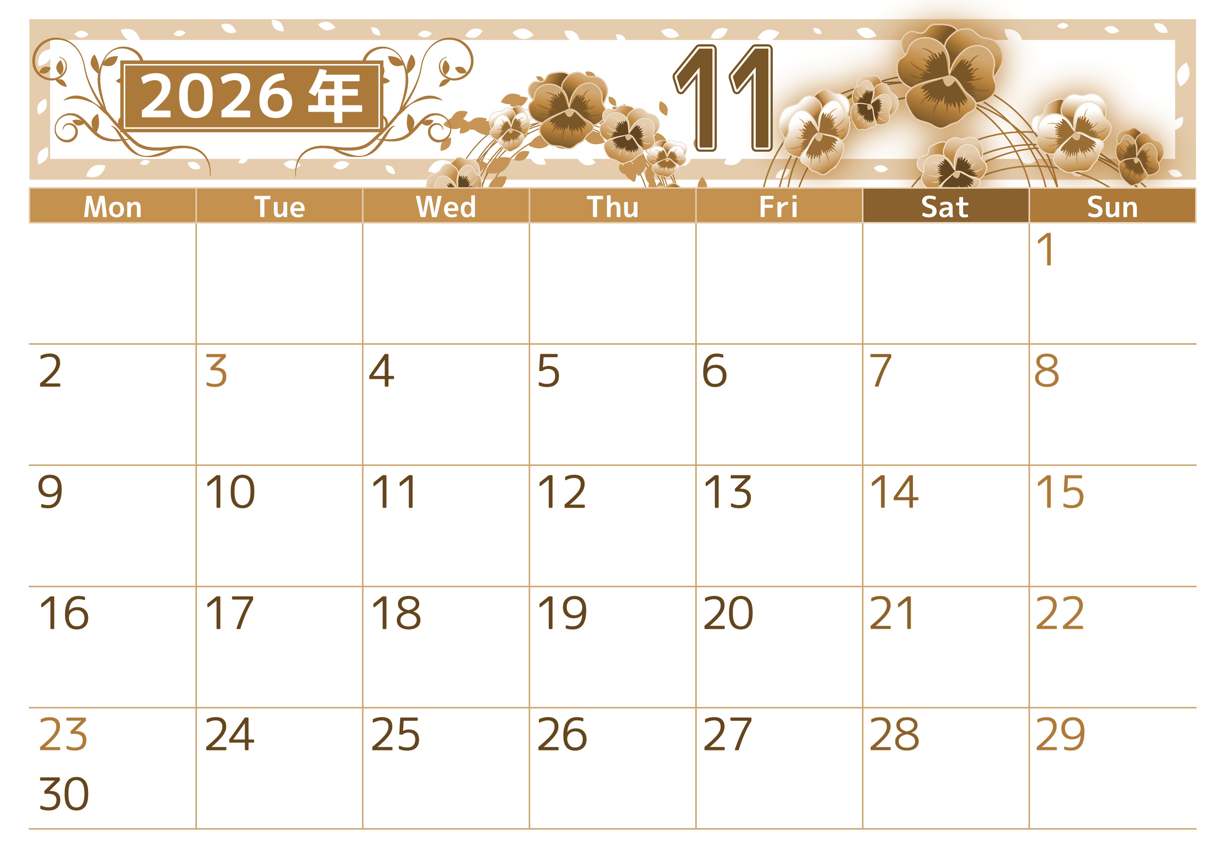 2026年11月横型レトロな月曜始まりの無料テンプレートセピア調カレンダーです。シックでおしゃれなパンジーをテーマにしたイラストを楽しみながらプランニングができるセピア調カレンダーとなっています。月曜始まりなのでおすすめです。(2026-00761101)