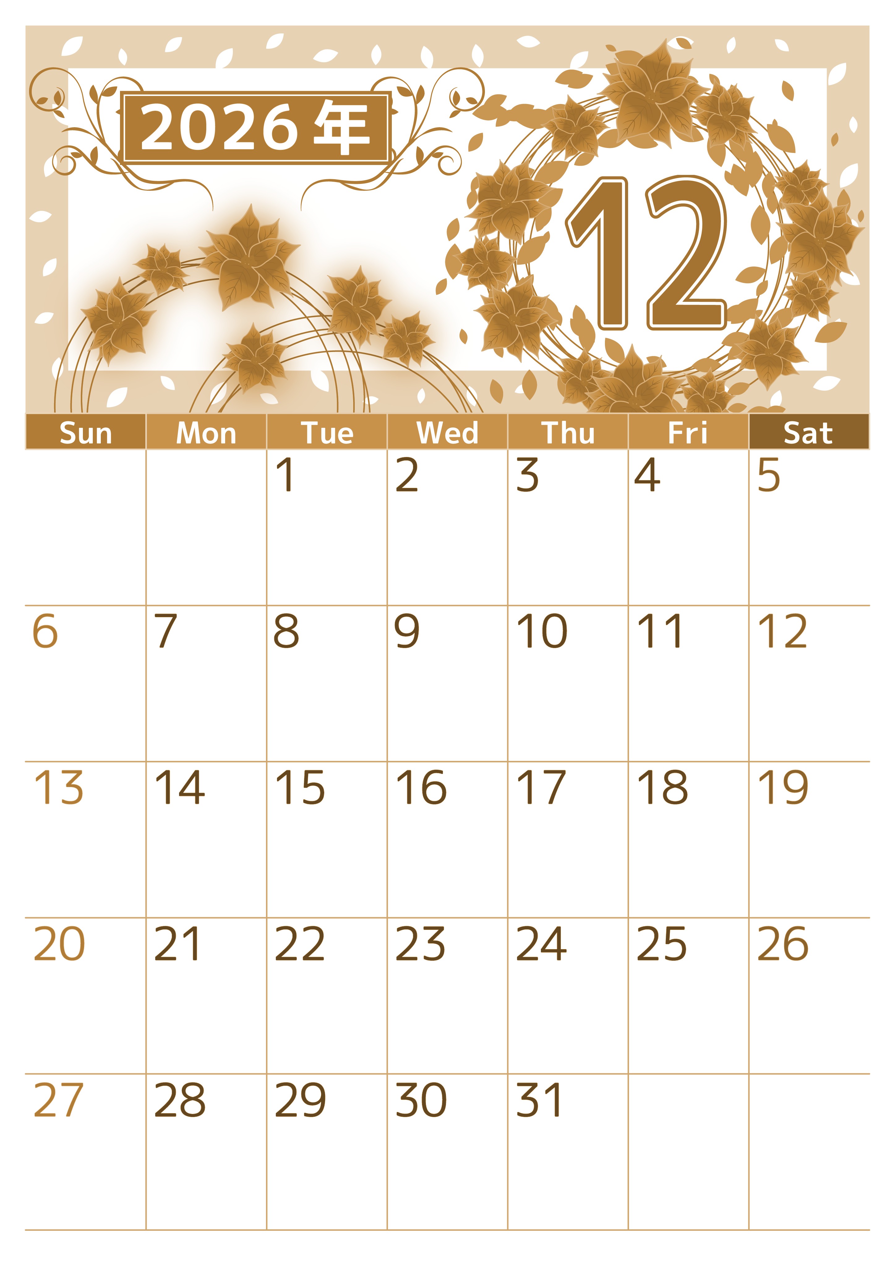 2026年12月縦型レトロな日曜始まりの無料テンプレートセピア調カレンダーです。クリスマスといえばポインセチア。イラストがおしゃれなだけでなくセピア調カレンダー部分も罫線がはっきりとしているので見やすい実用性が高い無料コンテンツです。(2026-00761210)