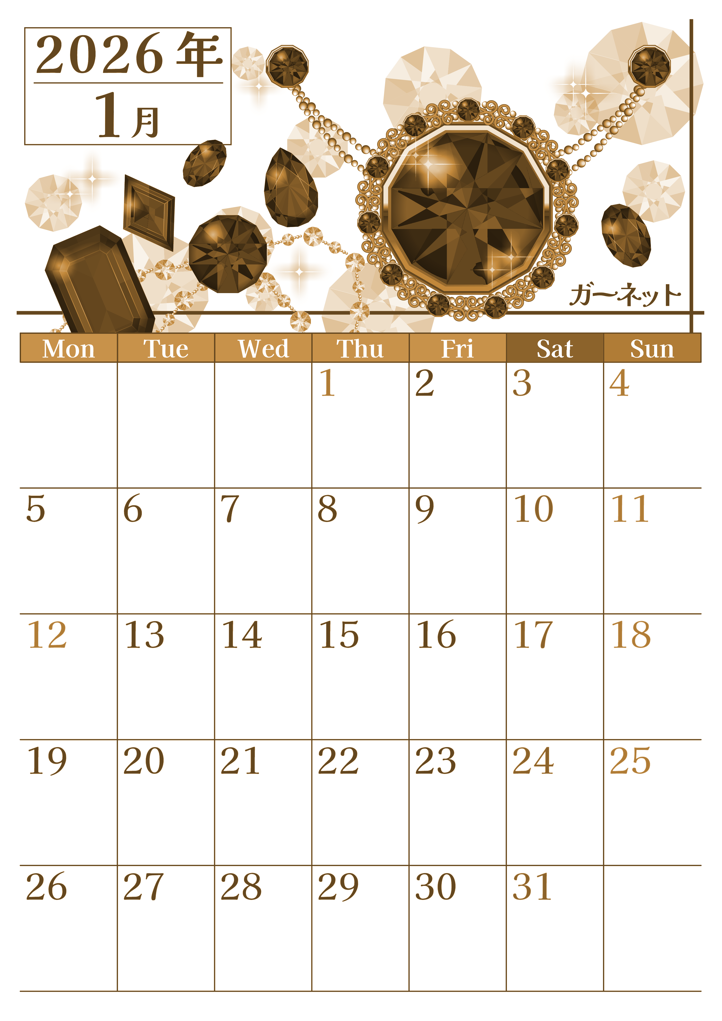 2026年1月縦型レトロな月曜始まりの無料テンプレートセピア調カレンダーです。ガーネットは赤い宝石で1月の誕生石にあたります。おしゃれで輝いている女性に特におすすめをしたいイラストセピア調カレンダーとなっています。(2026-00770111)