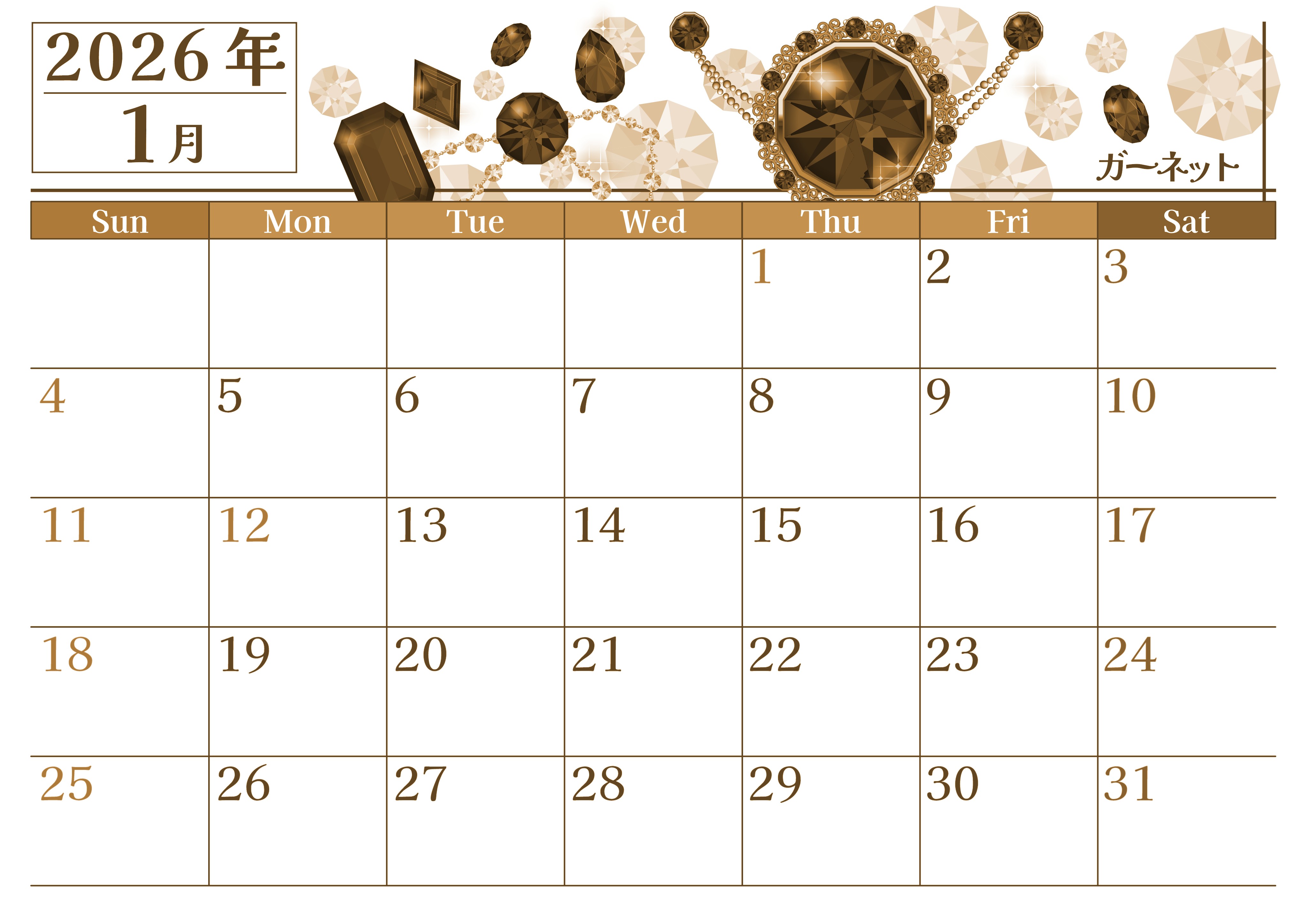 2026年1月横型レトロな日曜始まりの無料テンプレートセピア調カレンダーです。1月の誕生石であるガーネットのアクセサリーを贅沢に存在感あるように描いているおしゃれで女心をくすぐるようなイラストセピア調カレンダーです。(2026-00770100)