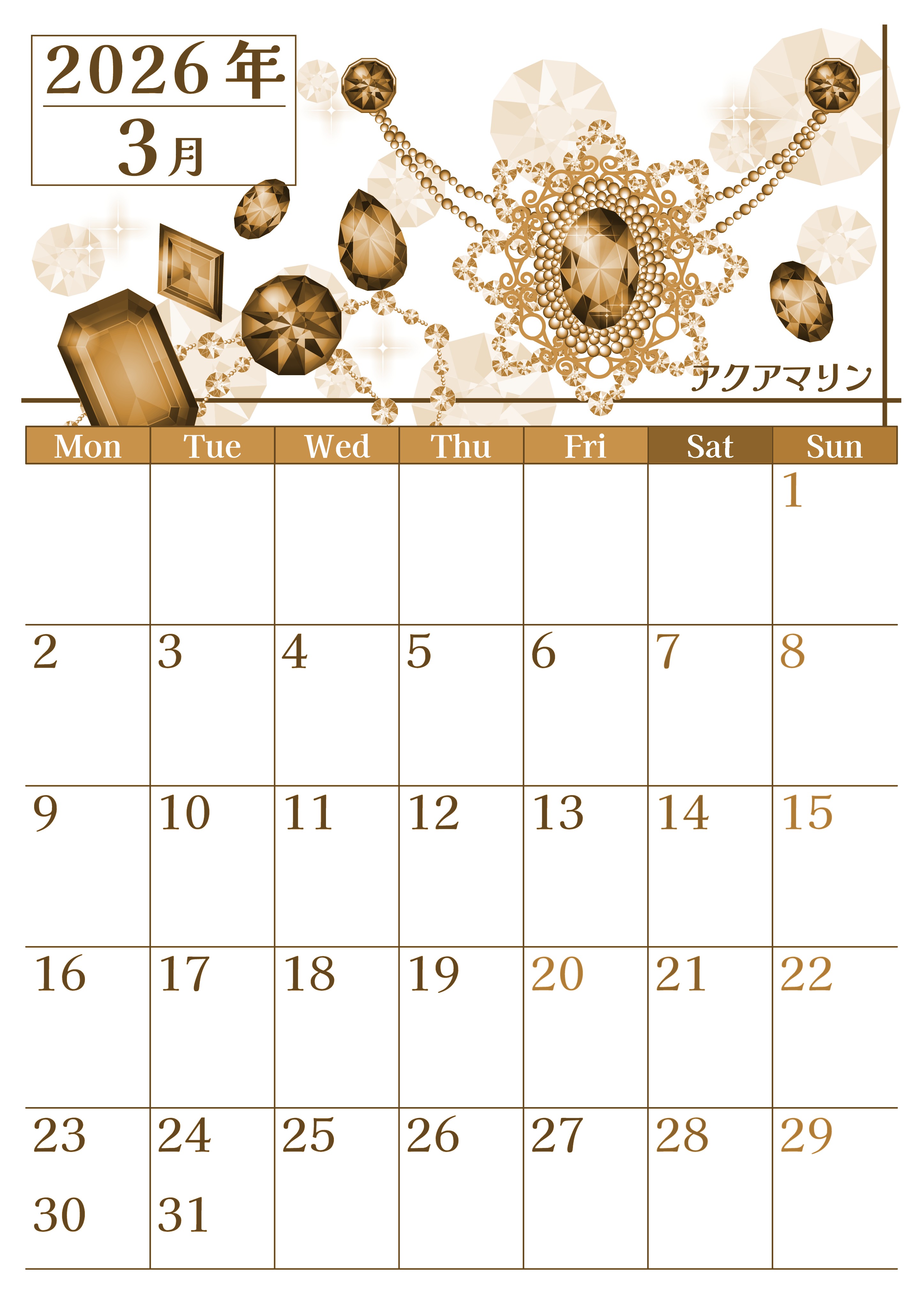 2026年3月縦型レトロな月曜始まりの無料テンプレートセピア調カレンダーです。アクアマリンは青い宝石で3月の誕生石にあたります。おしゃれで輝いている女性に特におすすめをしたいイラストセピア調カレンダーとなっています。(2026-00770311)