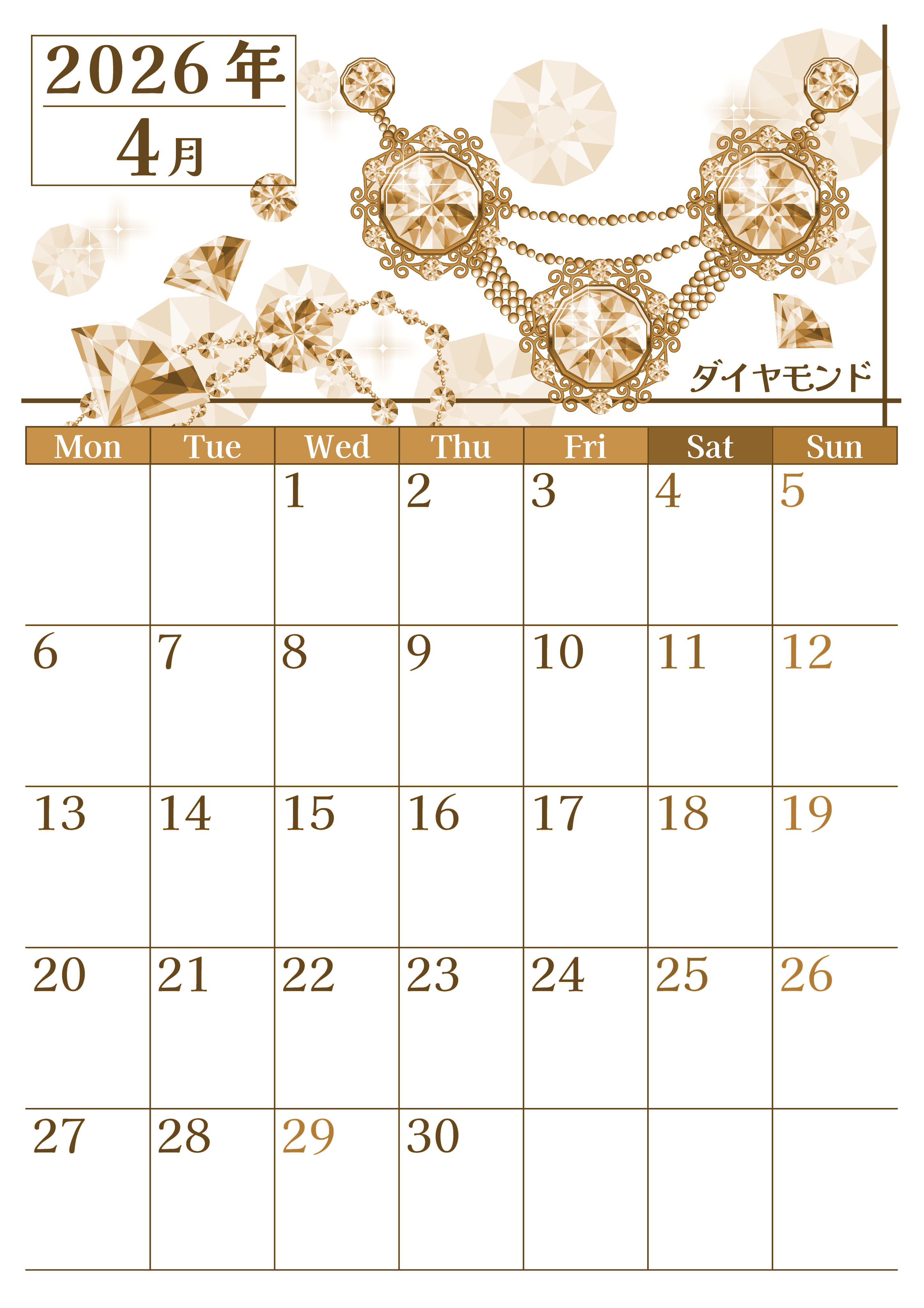 2026年4月縦型レトロな月曜始まりの無料テンプレートセピア調カレンダーです。ダイヤモンドは透明な宝石で4月の誕生石にあたります。おしゃれで輝いている女性に特におすすめをしたいイラストセピア調カレンダーとなっています。(2026-00770411)
