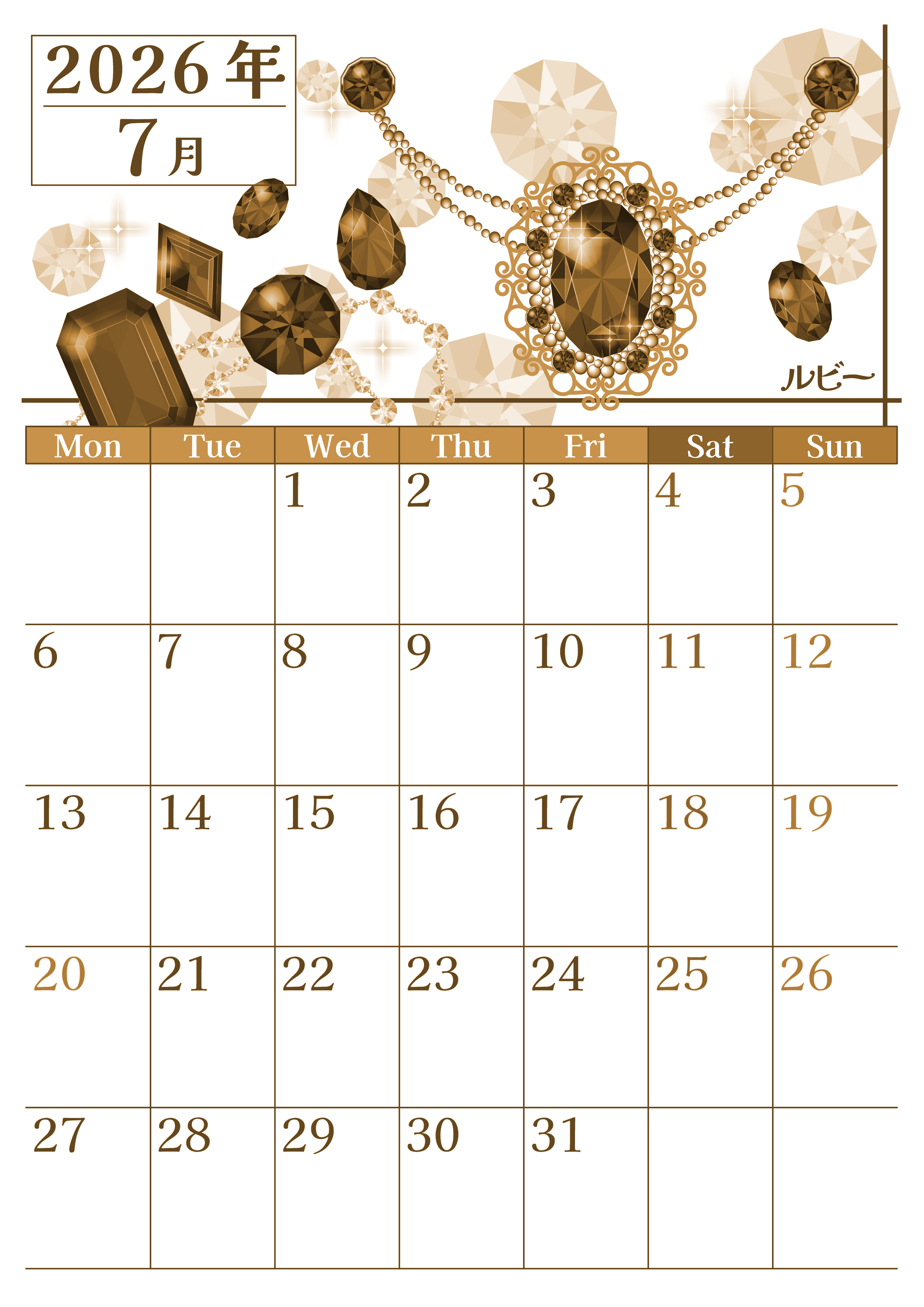 2026年7月縦型レトロな月曜始まりの無料テンプレートセピア調カレンダーです。ルビーは赤色の宝石で7月の誕生石にあたります。おしゃれで輝いている女性に特におすすめをしたいイラストセピア調カレンダーとなっています。(2026-00770711)
